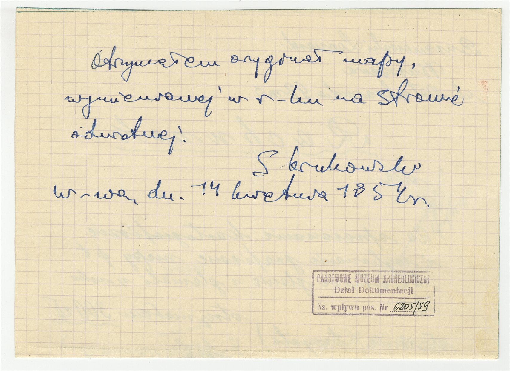 Rękopis rachunku Leonarda Baranowskiego za opracowanie kartograficzne i wykonanie graficzne mapy pt. "Dniestrowe glenie i gleniaki w roku 1954" Warszawa 13 IV [19]54 r. - strona 2: notatka Stefana Krukowskiego poświadczająca otrzymanie mapy Warszawa 14 kwietnia 1954 r.