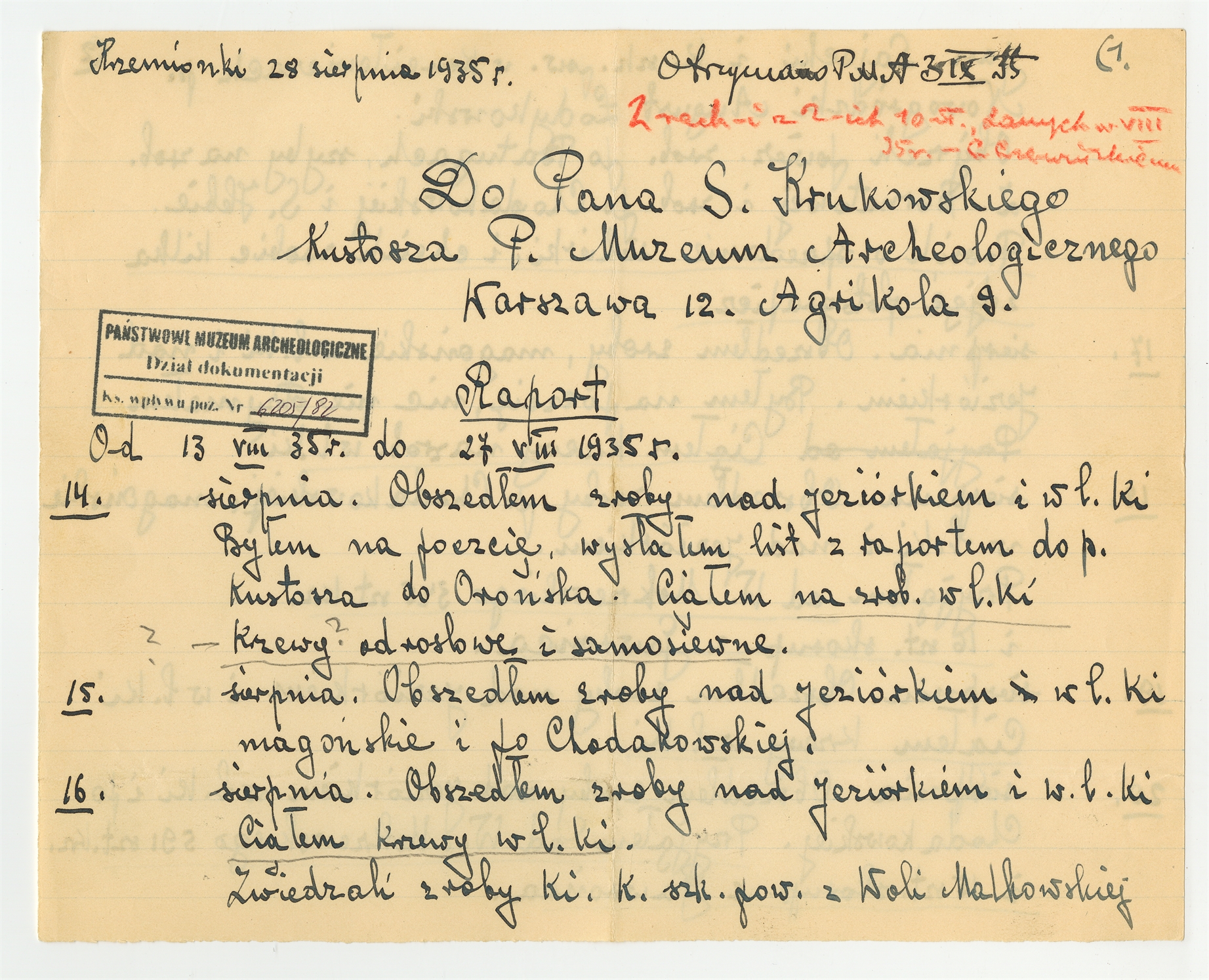 Rękopis - raport strażnika Krzemionek C. Czerwińskiego z dnia 28 sierpnia 1935 roku z okresu 13 - 27 VIII 1935 roku - strona 1