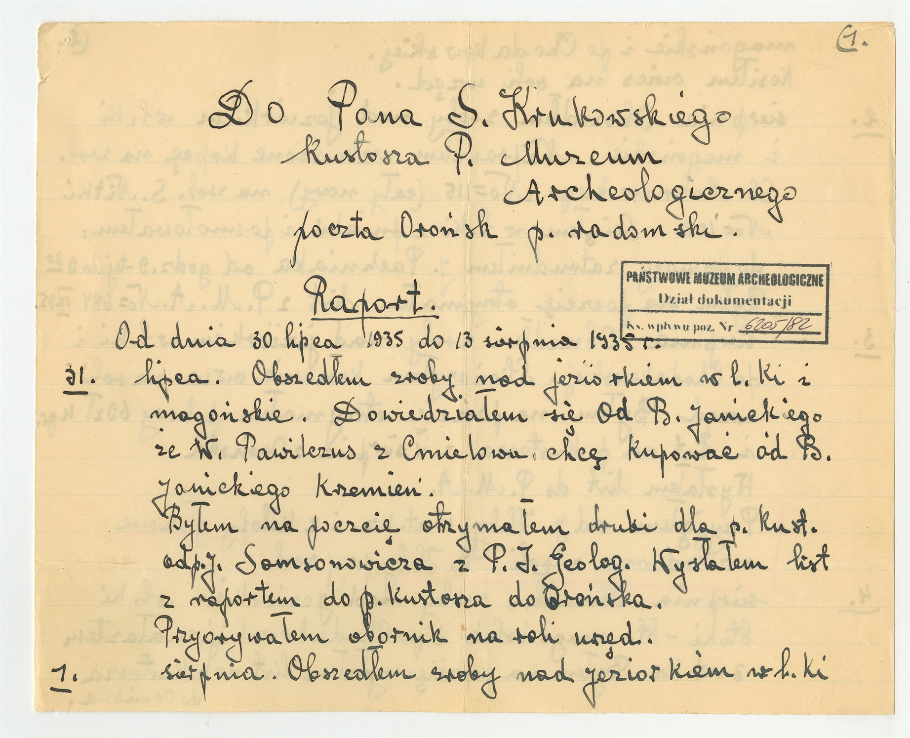 Rękopis - raport strażnika Krzemionek C. Czerwińskiego z dnia 30 lipca 1935 roku z okresu 30 lipca - 13 sierpnia 1935 roku - strona 1