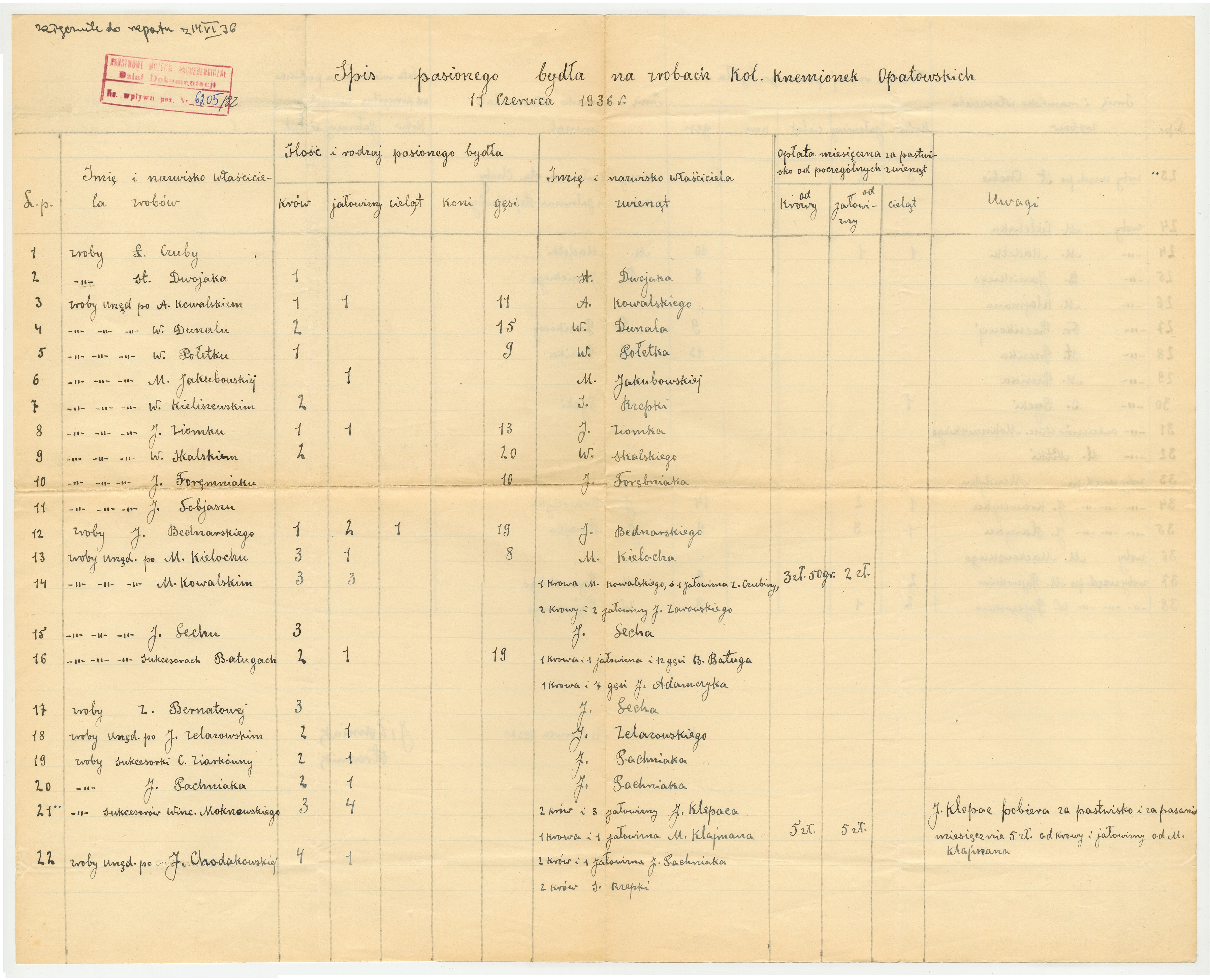 Rękopis - raport strażnika Krzemionek J.Pachniaka - "Spis pasionego bydła na zrobach kol. Krzemionek Opatowskich 11 czerwca 1936 r."