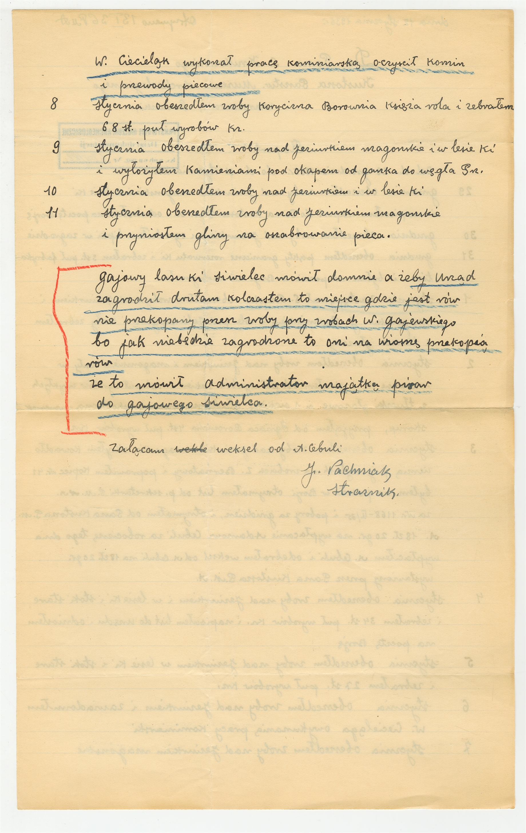 Rękopis - raport strażnika Krzemionek J. Pachniaka z dnia 12 stycznia 1936 roku z okresu 29 grudnia 1935 roku - 11 stycznia 1936 roku
