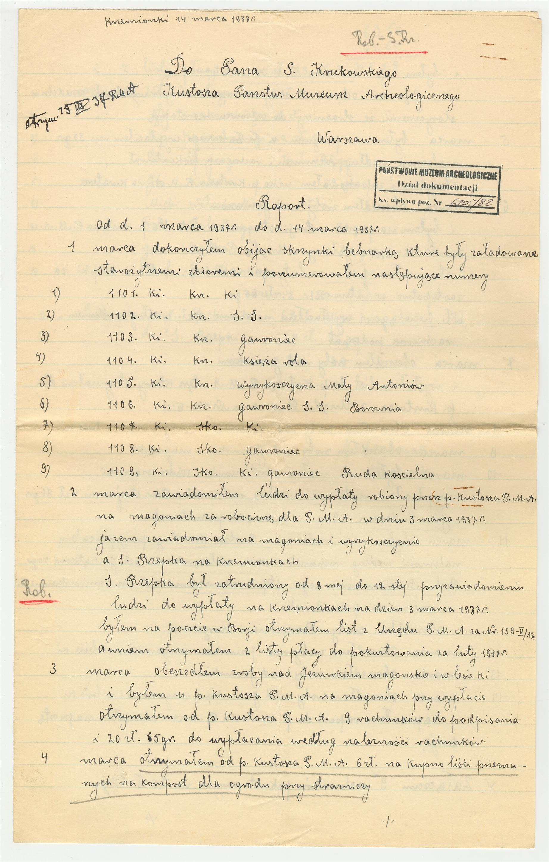 Rękopis - raport strażnika Krzemionek J. Pachniaka z dnia 14 marca 1937 roku z okresu 1 - 14 marca 1937 roku