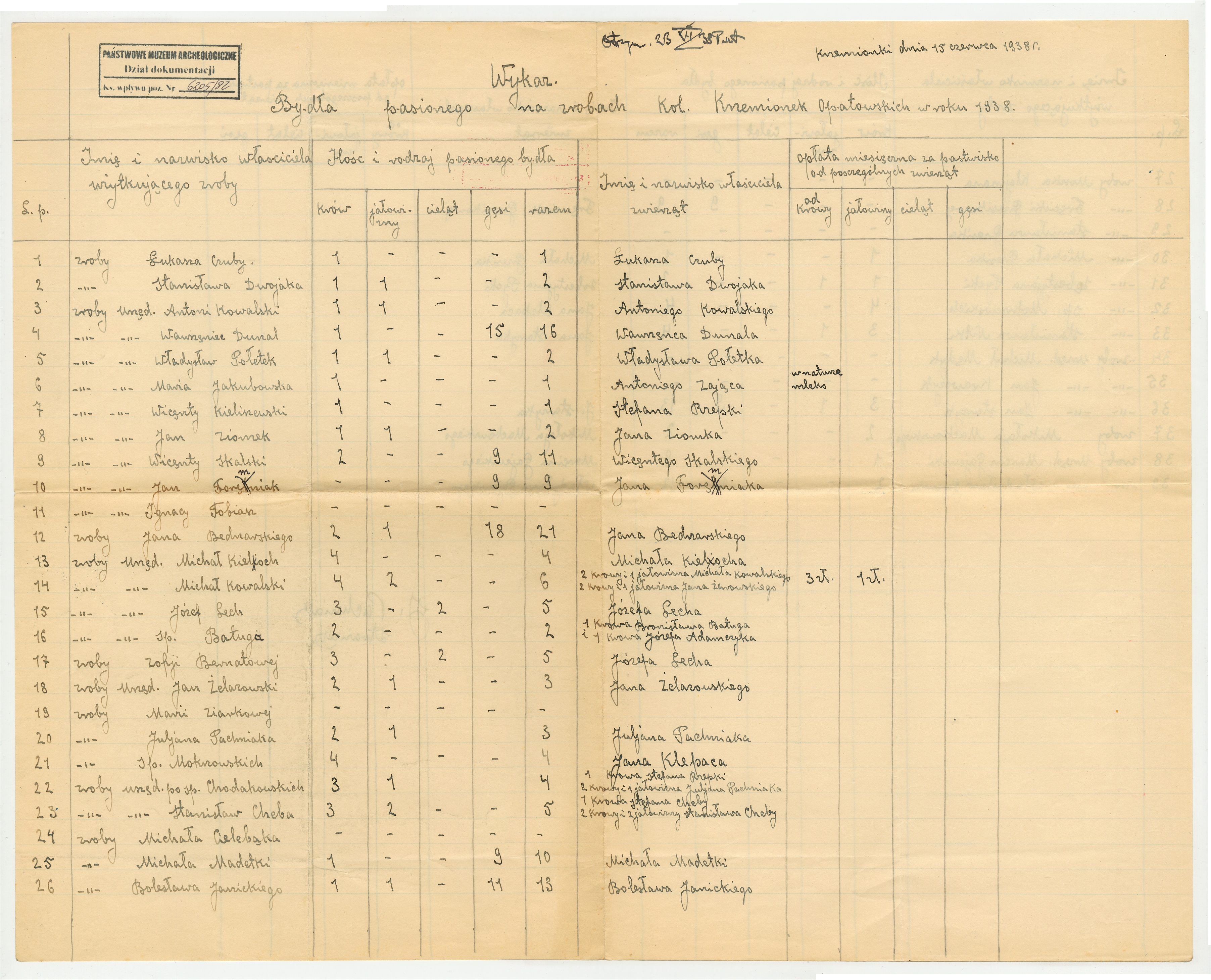 Rękopis - raport strażnika Krzemionek J.Pachniaka z dnia 15 czerwca 1938 roku - "Spis bydła pasionego na zrobach kol. Krzemionek Opatowskich w roku 1938"