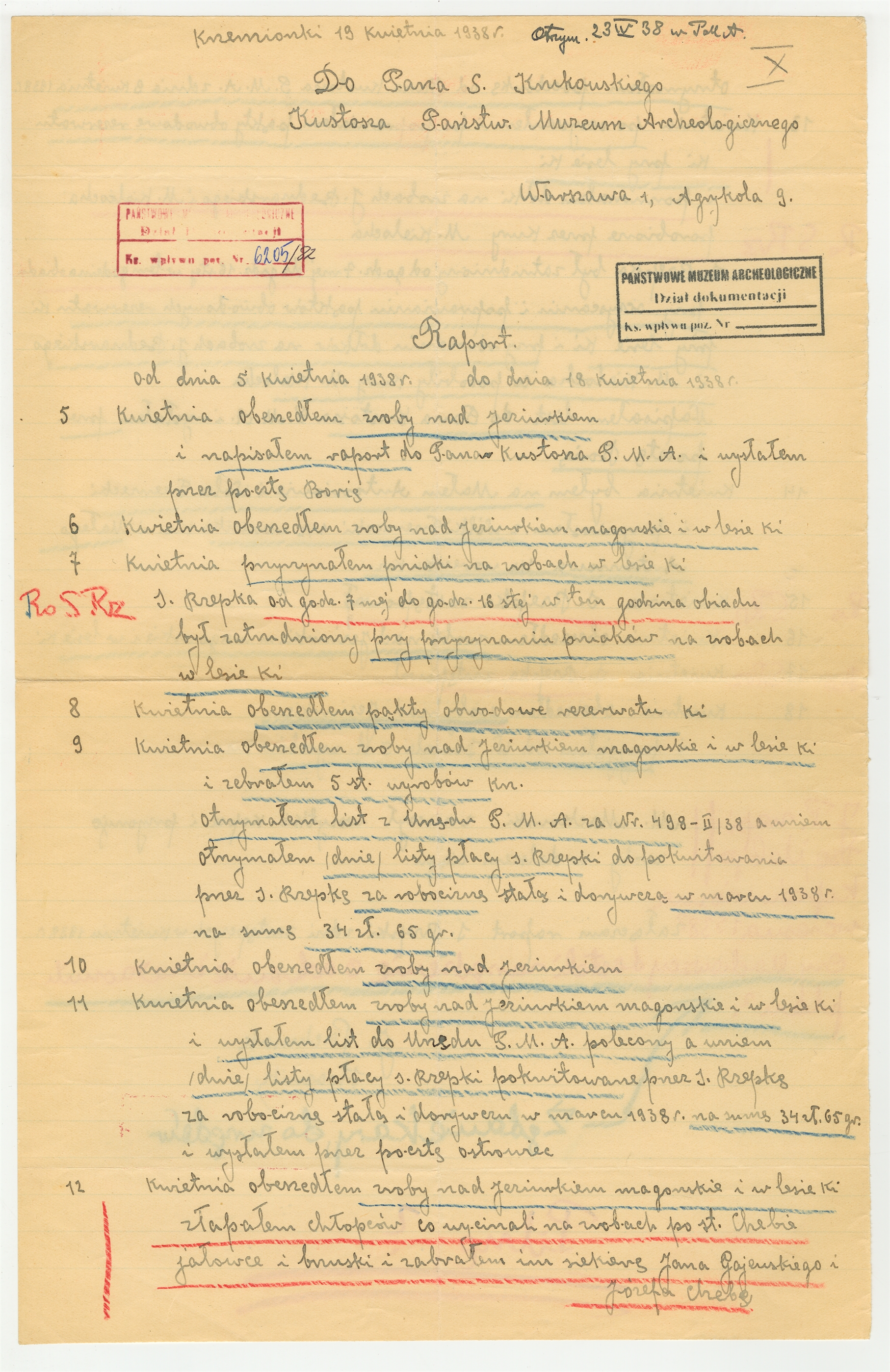 Rękopis - raport strażnika Krzemionek J. Pachniaka z dnia 19 kwietnia 1938 roku z okresu 5 - 18 kwietnia 1938 roku