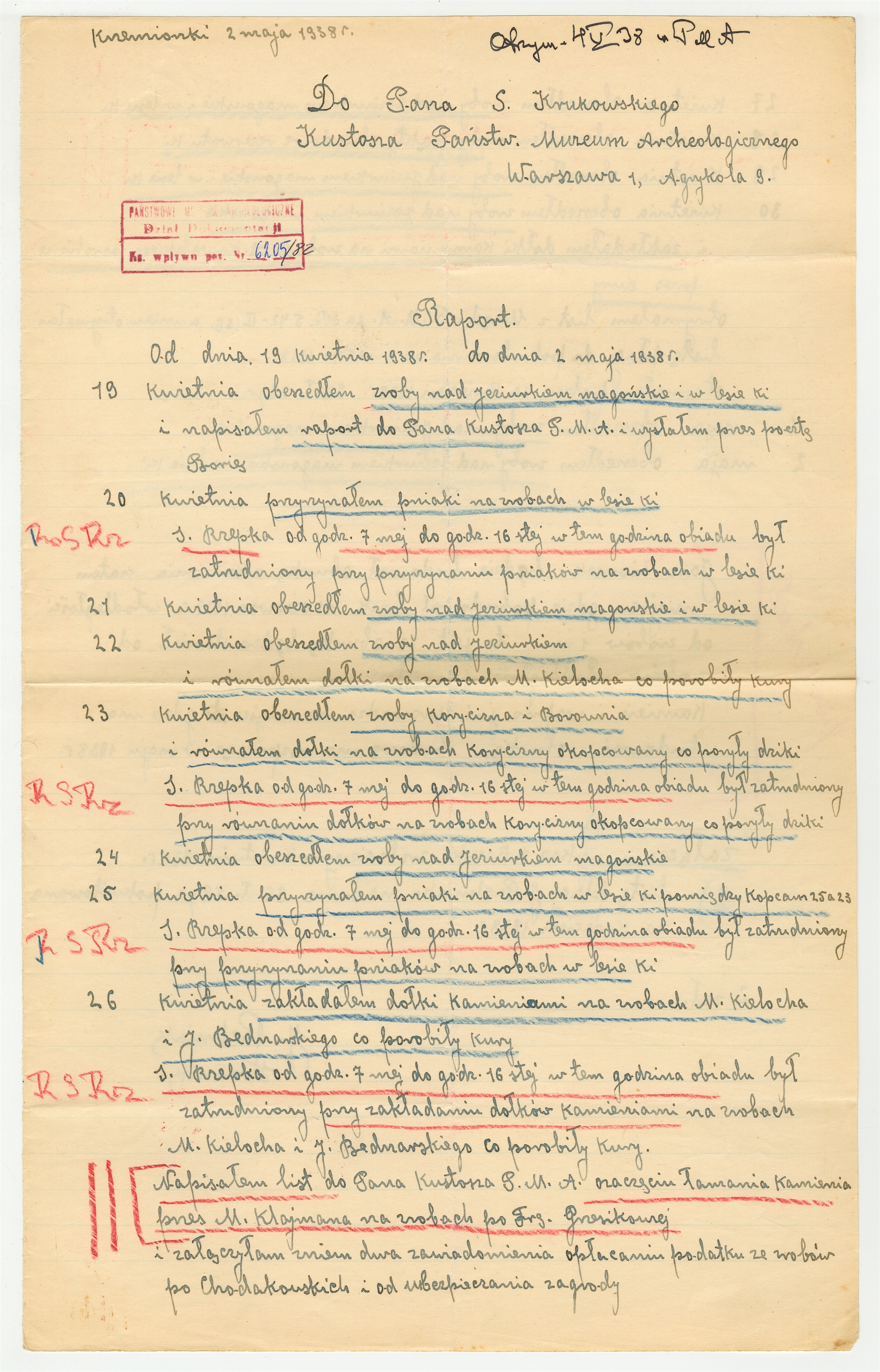 Rękopis - raport strażnika Krzemionek J. Pachniaka z dnia 2 maja 1938 roku z okresu 19 kwietnia - 2 maja 1938 roku
