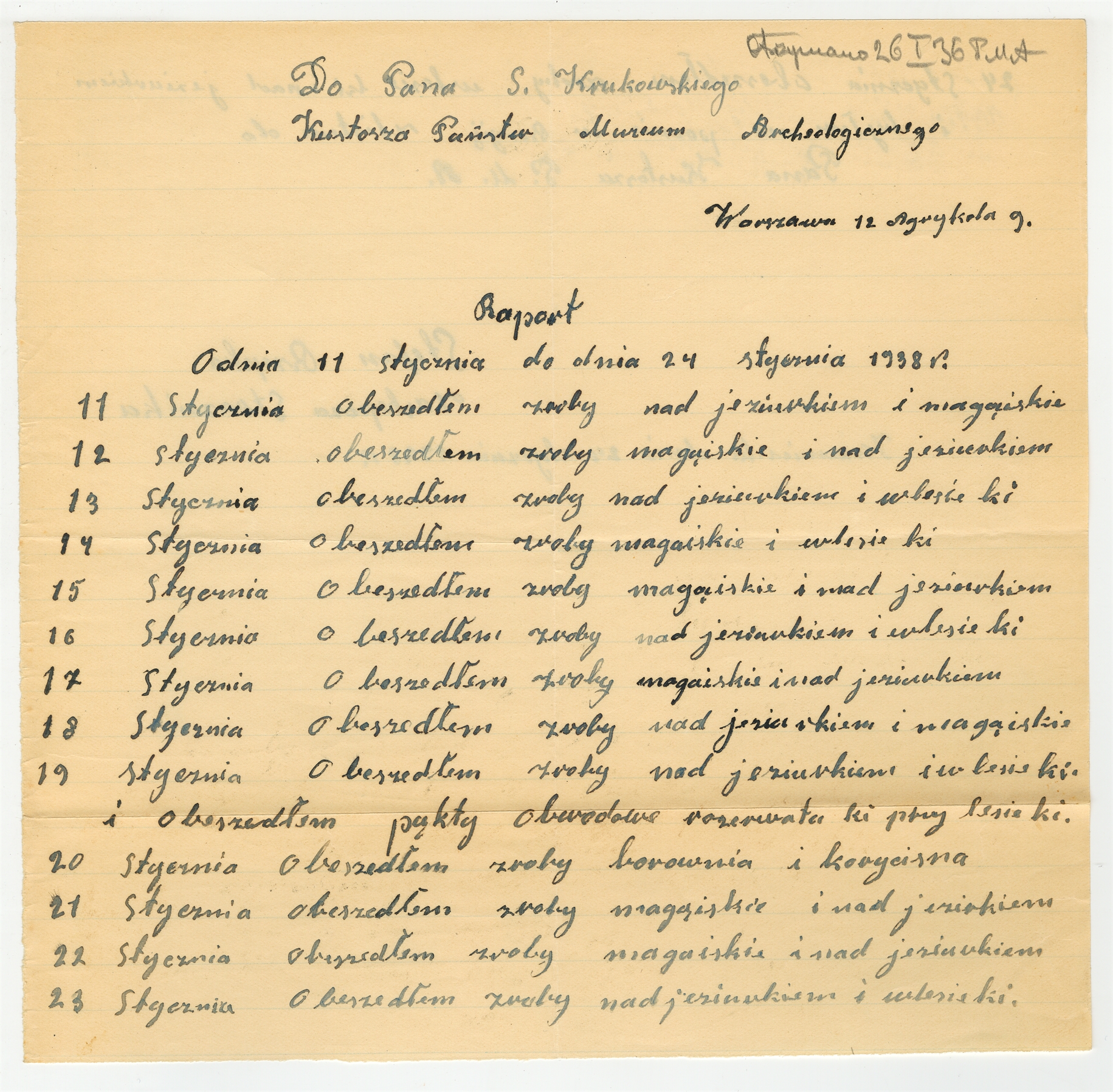 Rękopis - raport strażnika Krzemionek J. Pachniaka z dnia 24 stycznia 1938 roku z okresu 11-20 stycznia 1938 roku