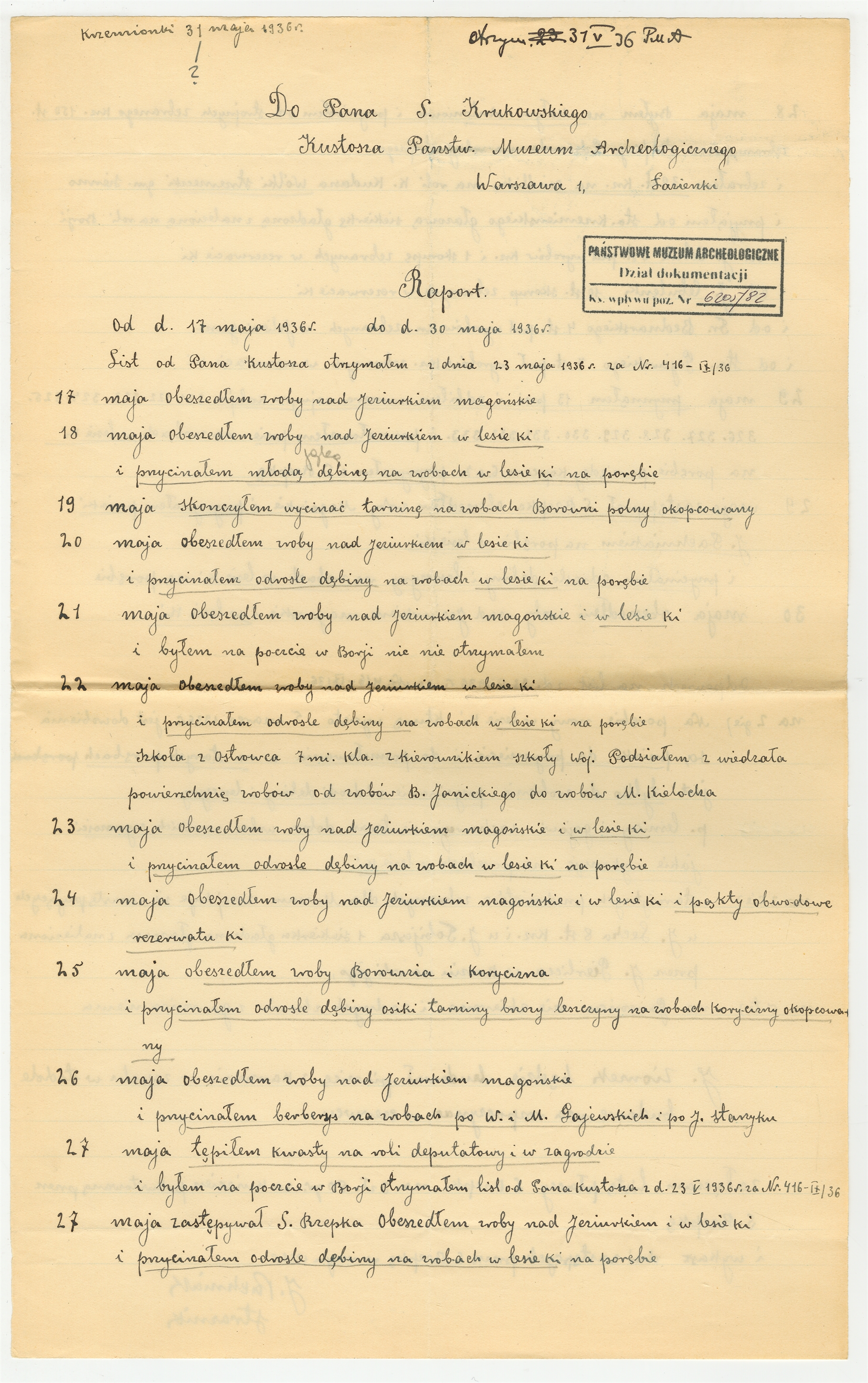 Rękopis - raport strażnika Krzemionek J. Pachniaka z dnia 31 maja 1936 roku z okresu 17 -30 maja 1936 roku
