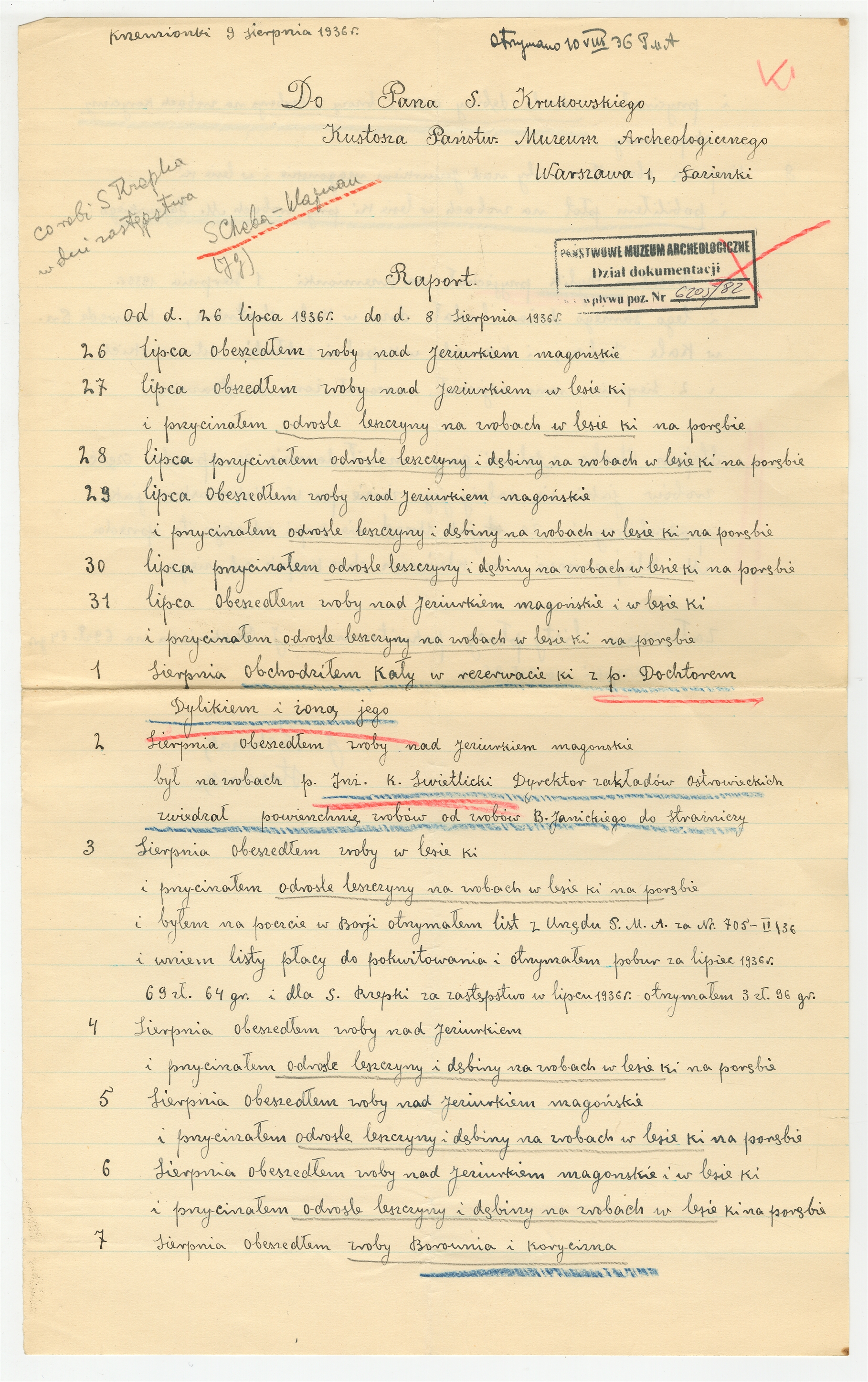 Rękopis - raport strażnika Krzemionek J. Pachniaka z dnia 9 sierpnia 1936 roku z okresu 26 lipca - 8 sierpnia 1936 roku