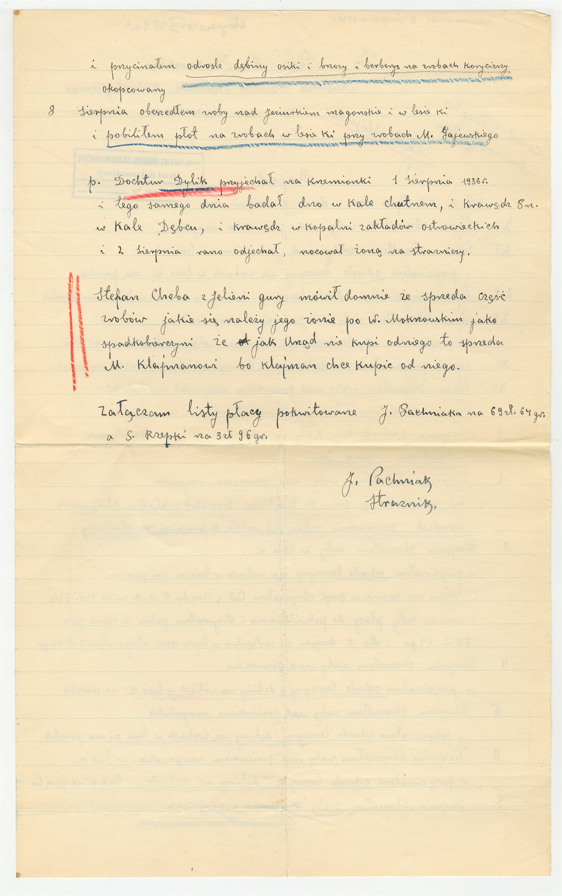 Rękopis - raport strażnika Krzemionek J. Pachniaka z dnia 9 sierpnia 1936 roku z okresu 26 lipca - 8 sierpnia 1936 roku (cd)