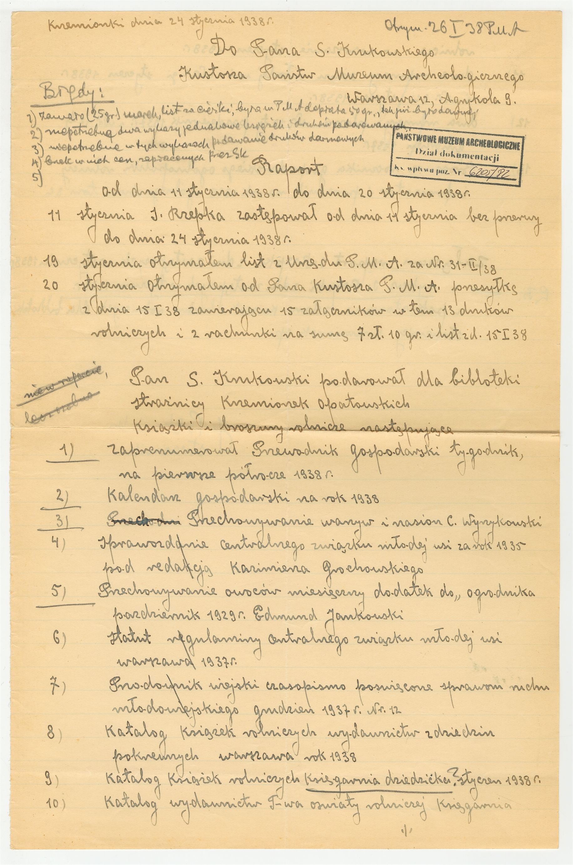 Rękopis - raport zastępcy strażnika Krzemionek Stefana Rzepki z dnia 24 stycznia 1938 roku z okresu 11-24 stycznia 1938 roku