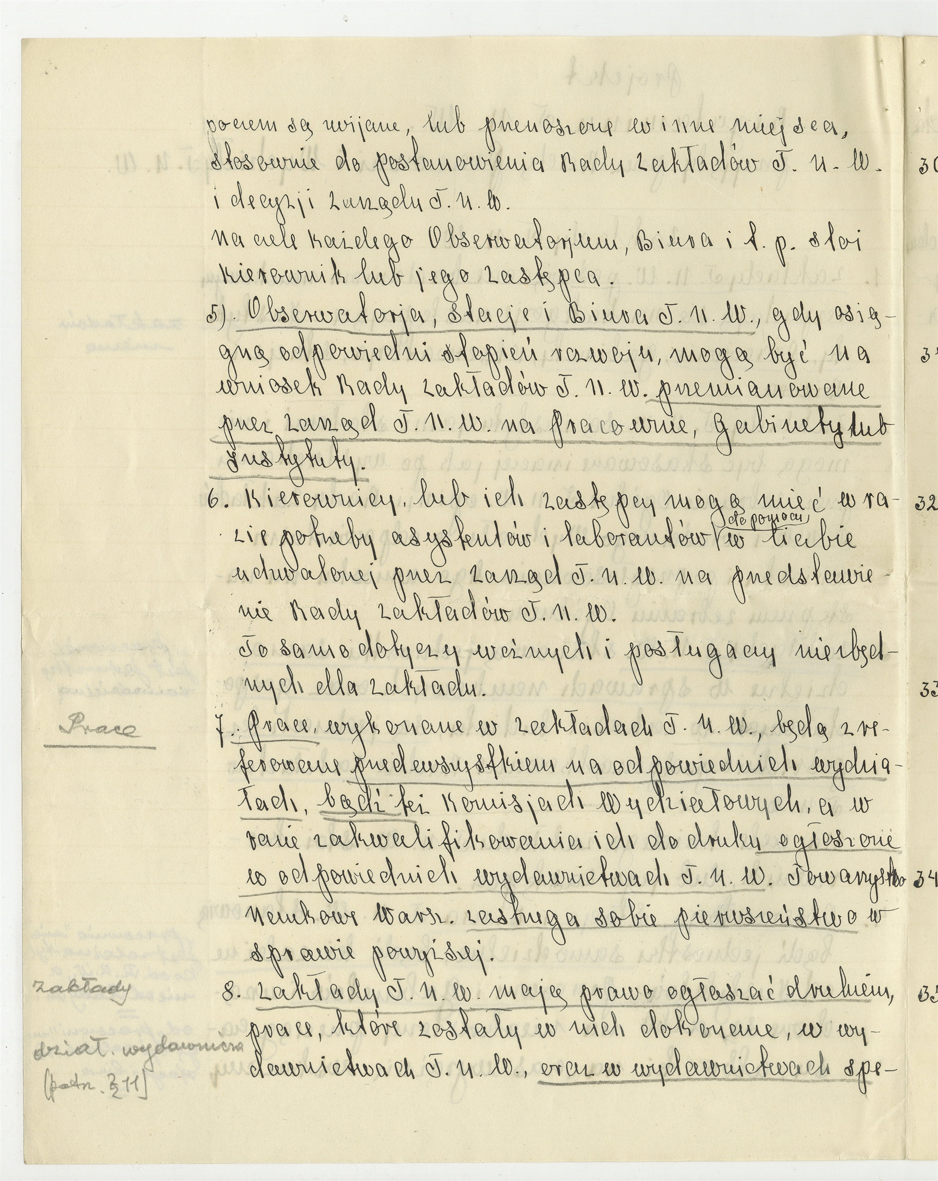 Rękopis regulaminu Zakładów Towarzystwa Naukowego Warszawskiego zatwierdzonego przez Zarząd TNW 12 kwietnia 1920 r. - strona 3: "Zakłady T.N.W" c.d. (pkt. 5-8)