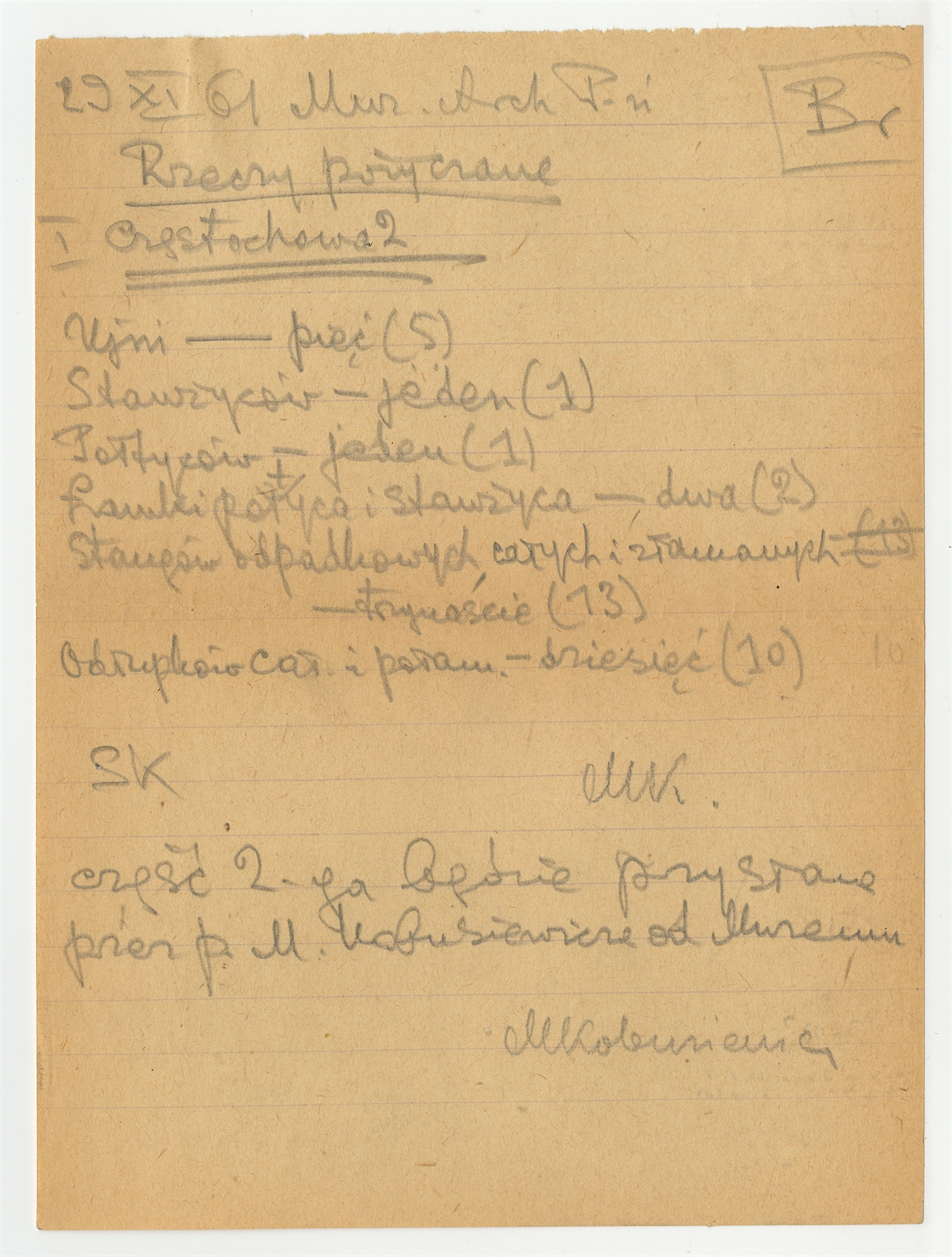 Rękopis - rewers z wykazem rzeczy pożyczonych z Muzeum Archeologicznego w Poznaniu ze stanowiska Częstochowa 2