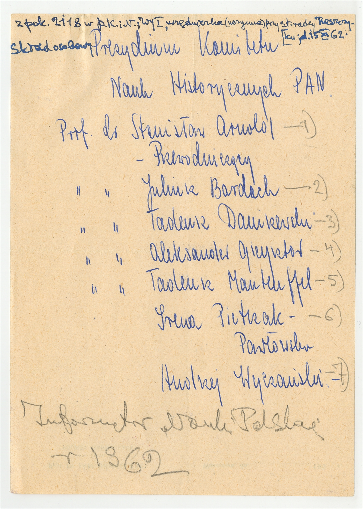 Rękopis - skład osobowy Prezydium Komitetu Nauk Historycznych PAN