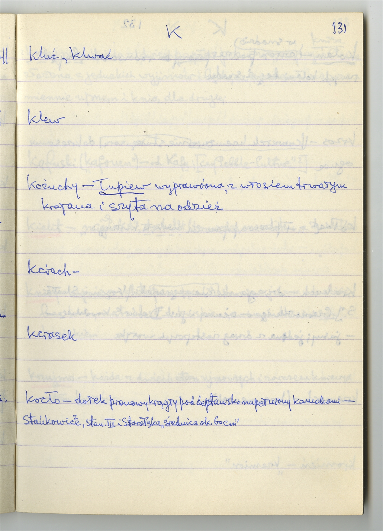 Rękopis słownika sporządzony w zeszycie w linię zatytułowany "K-O i K2 s. 121-240" - strona 12: hasła słownikowe na literę K c.d. (autorska strona 131)