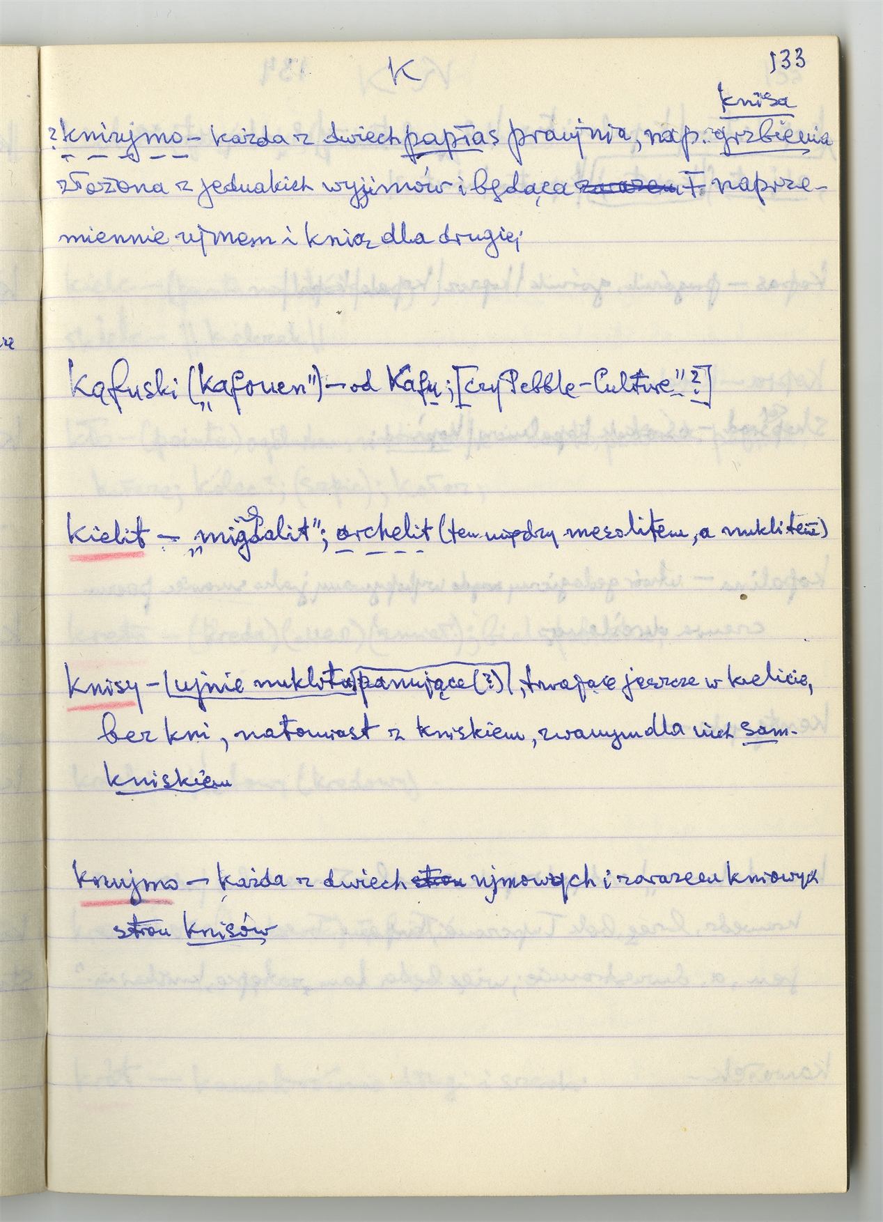 Rękopis słownika sporządzony w zeszycie w linię zatytułowany "K-O i K2 s. 121-240" - strona 14: hasła słownikowe na literę K c.d. (autorska strona 133)