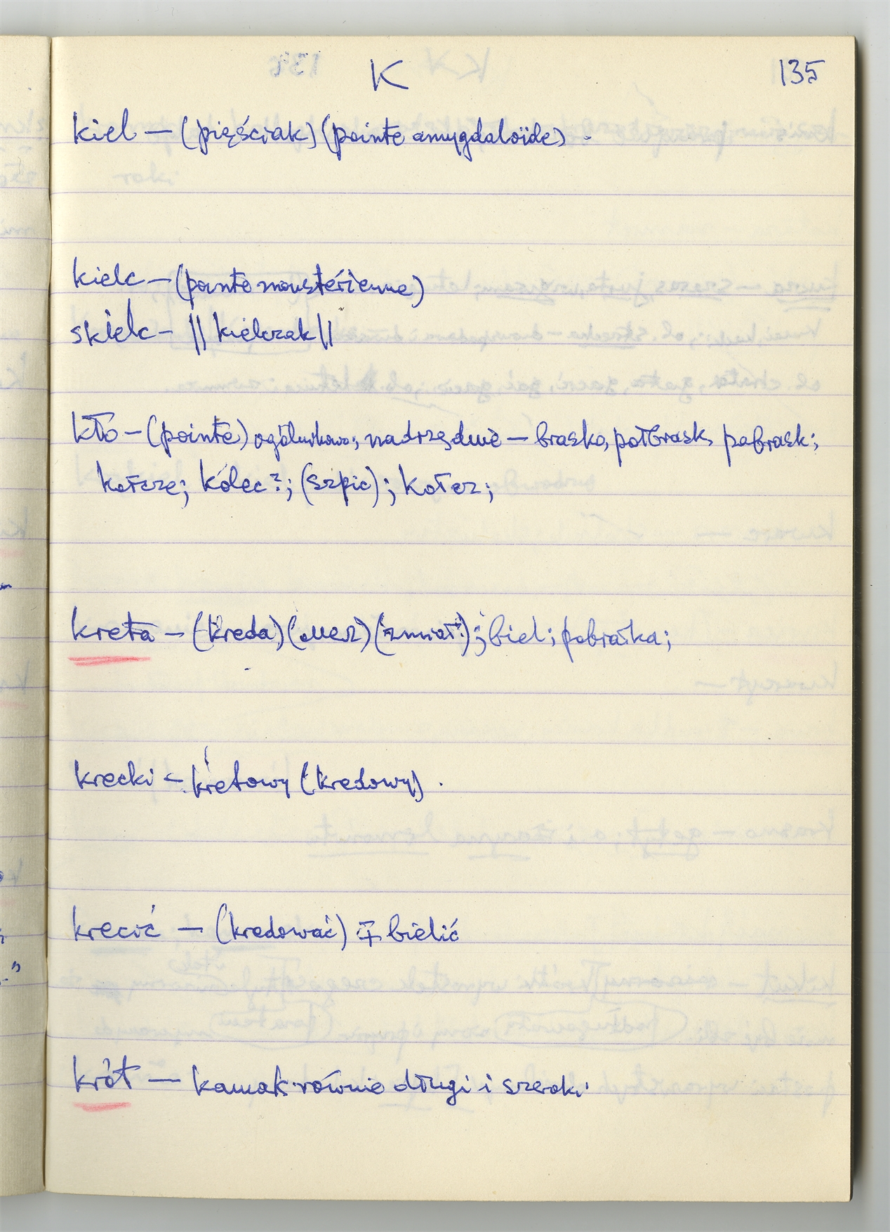 Rękopis słownika sporządzony w zeszycie w linię zatytułowany "K-O i K2 s. 121-240" - strona 16: hasła słownikowe na literę K c.d. (autorska strona 135)