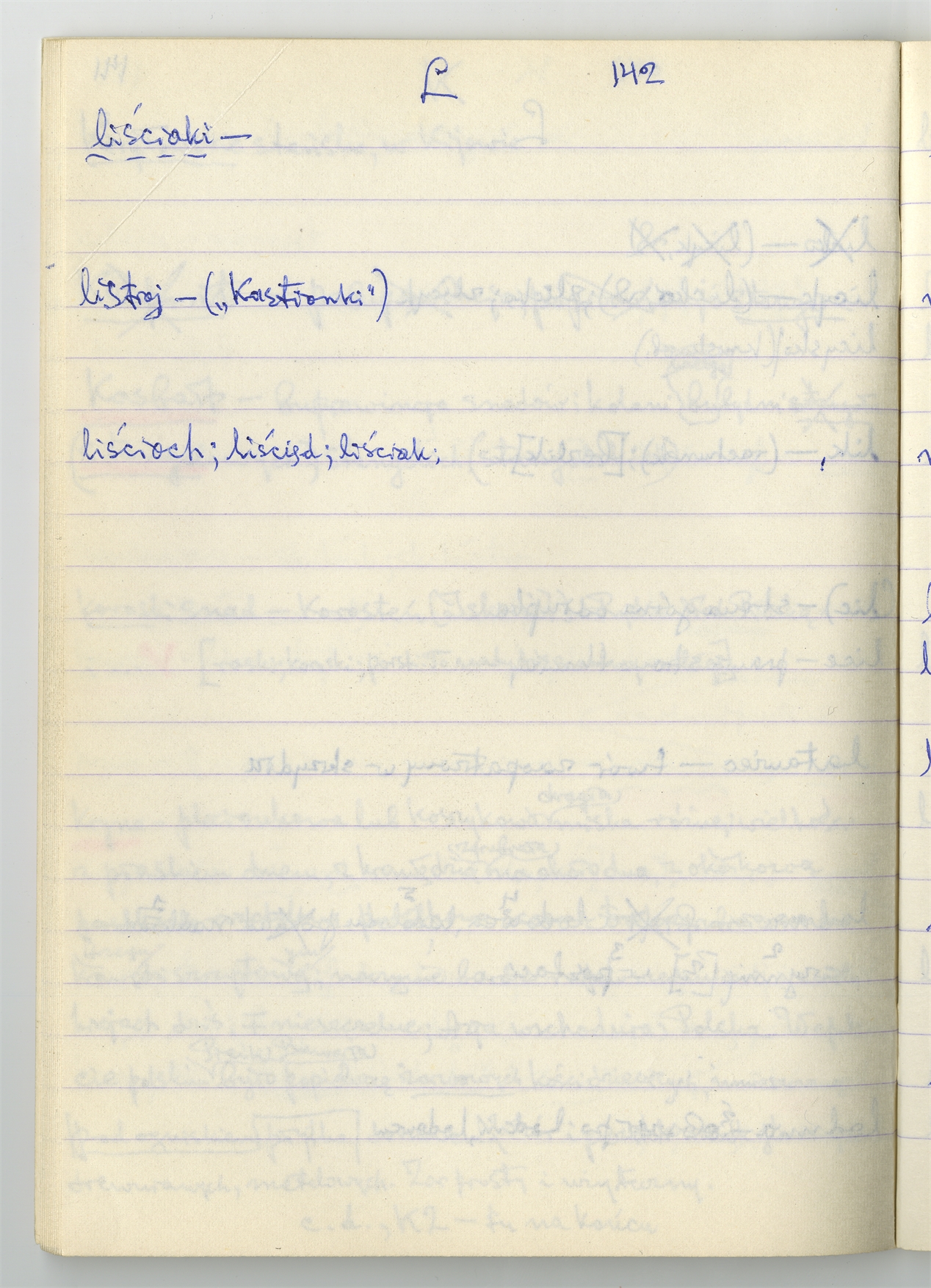 Rękopis słownika sporządzony w zeszycie w linię zatytułowany "K-O i K2 s. 121-240" - strona 23: hasła słownikowe na literę L c.d. (autorska strona 142)