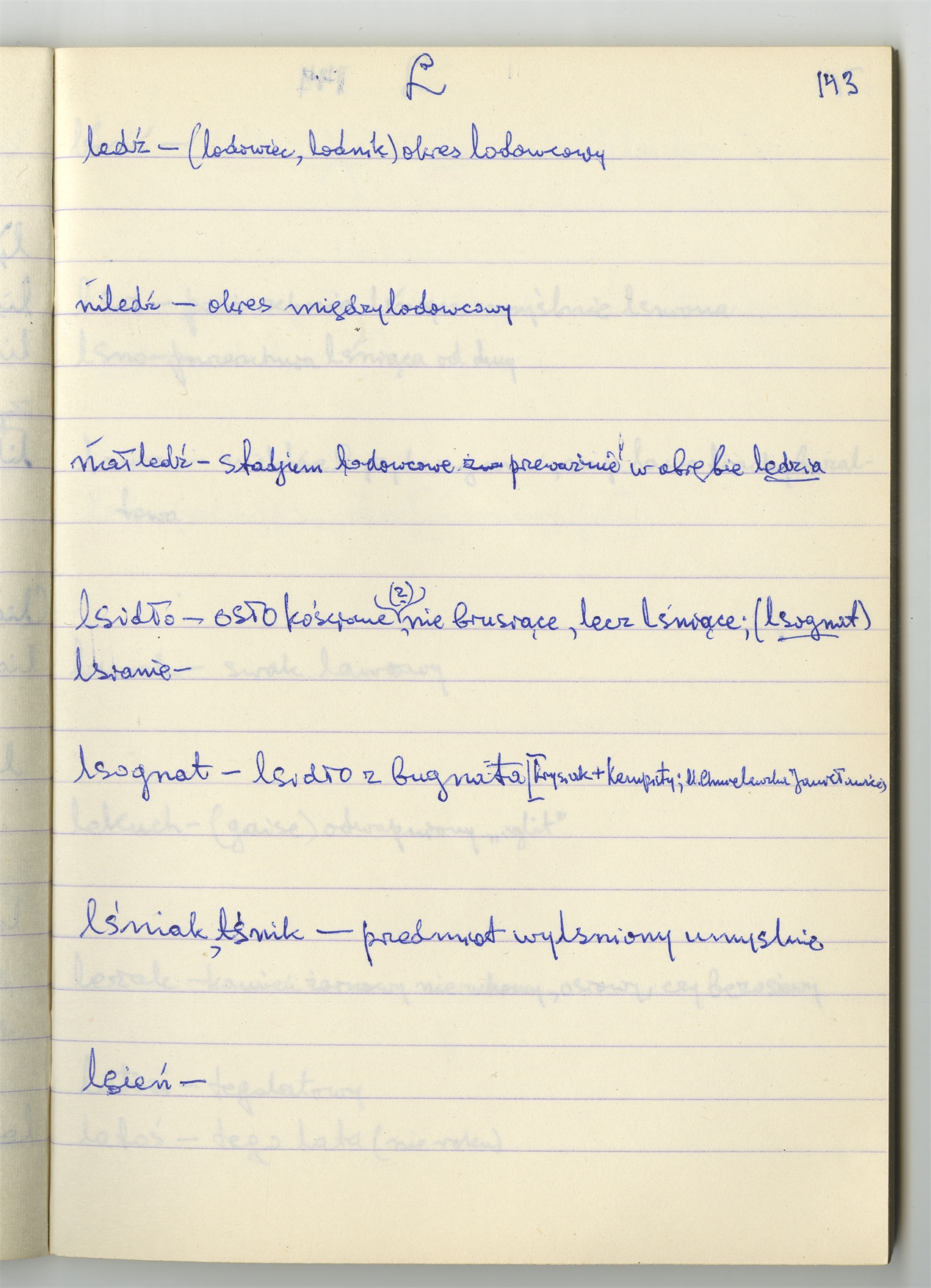 Rękopis słownika sporządzony w zeszycie w linię zatytułowany "K-O i K2 s. 121-240" - strona 24: hasła słownikowe na literę L c.d. (autorska strona 143)