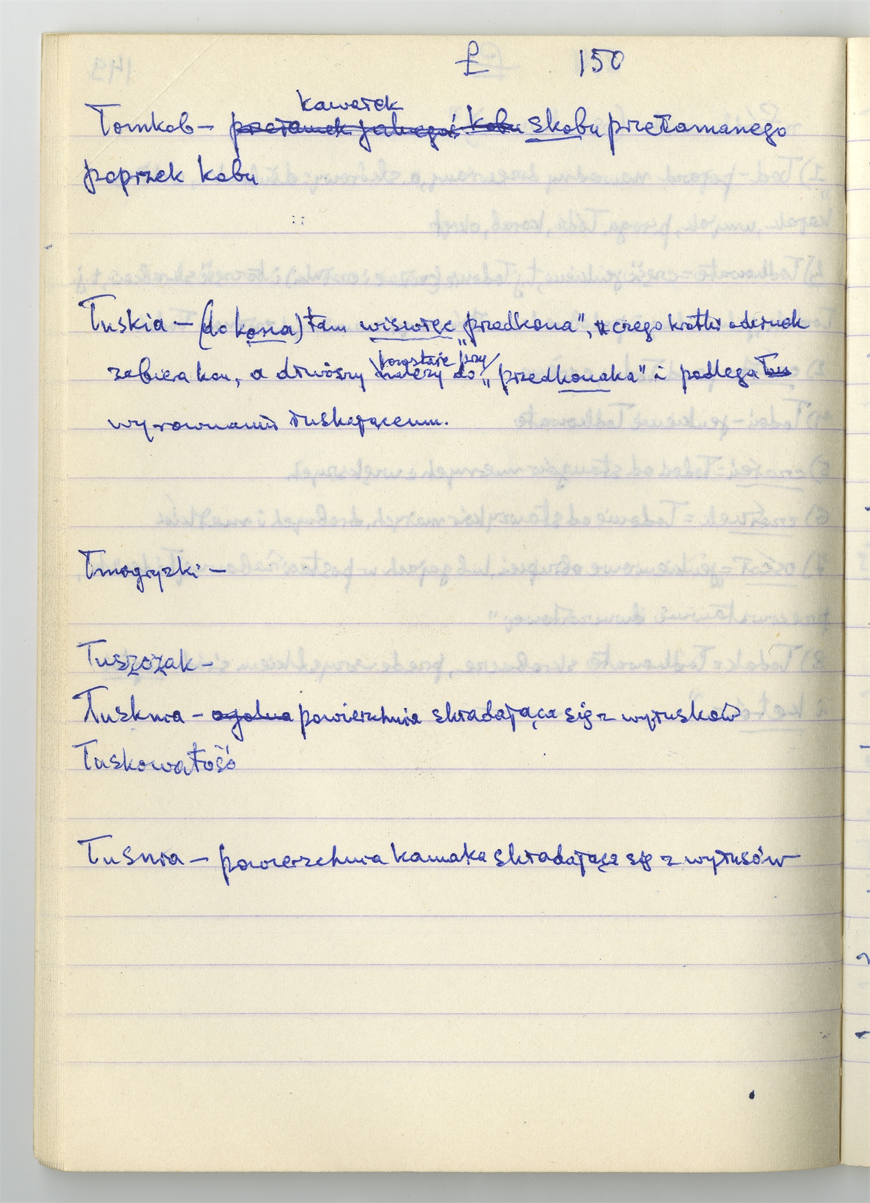Rękopis słownika sporządzony w zeszycie w linię zatytułowany "K-O i K2 s. 121-240" - strona 28: hasła słownikowe na literę Ł c.d. (autorska strona 150)
