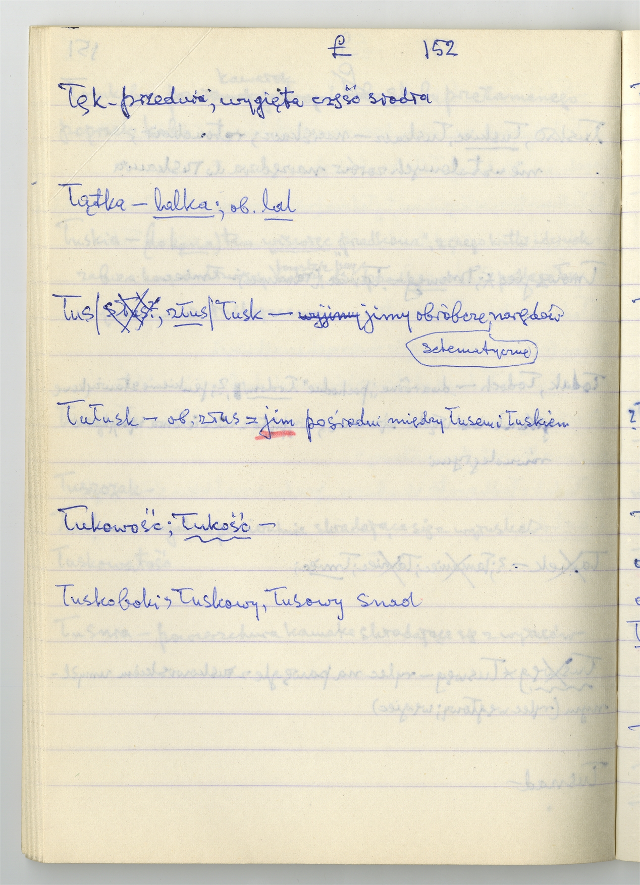 Rękopis słownika sporządzony w zeszycie w linię zatytułowany "K-O i K2 s. 121-240" - strona 30: hasła słownikowe na literę Ł c.d. (autorska strona 152)