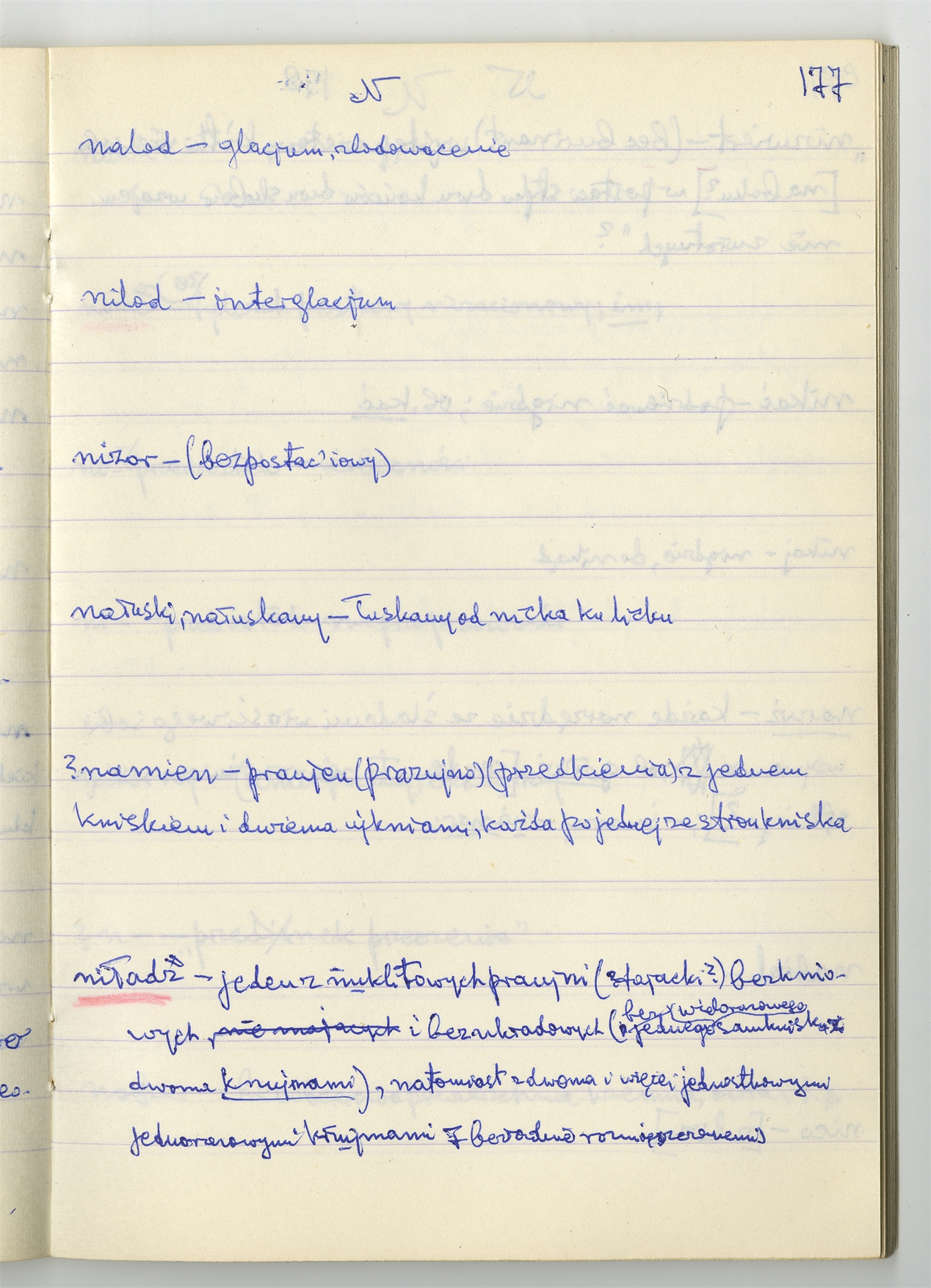 Rękopis słownika sporządzony w zeszycie w linię zatytułowany "K-O i K2 s. 121-240" - strona 43: hasła słownikowe na literę N c.d. (autorska strona 177)