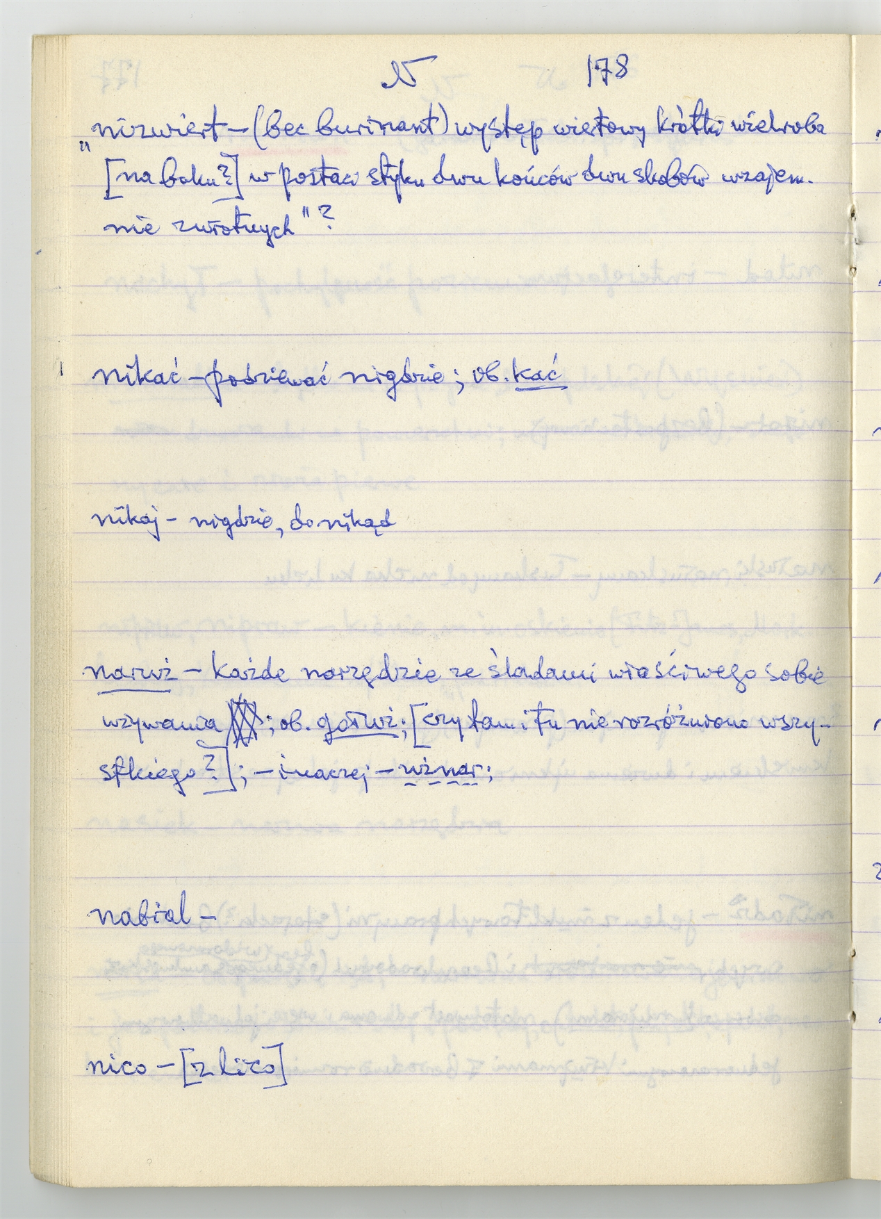 Rękopis słownika sporządzony w zeszycie w linię zatytułowany "K-O i K2 s. 121-240" - strona 44: hasła słownikowe na literę N c.d. (autorska strona 178)