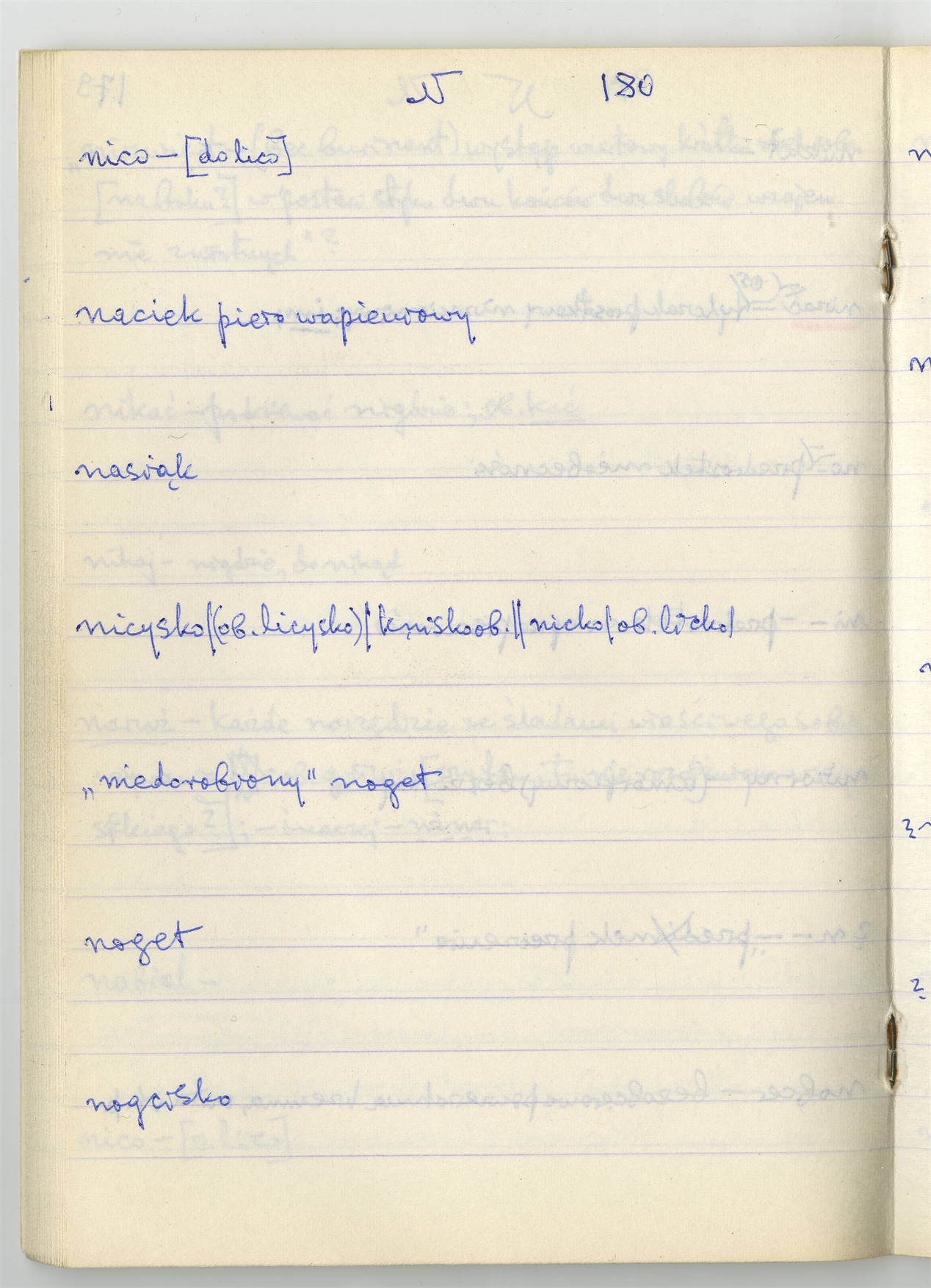 Rękopis słownika sporządzony w zeszycie w linię zatytułowany "K-O i K2 s. 121-240" - strona 46: hasła słownikowe na literę N c.d. (autorska strona 180)