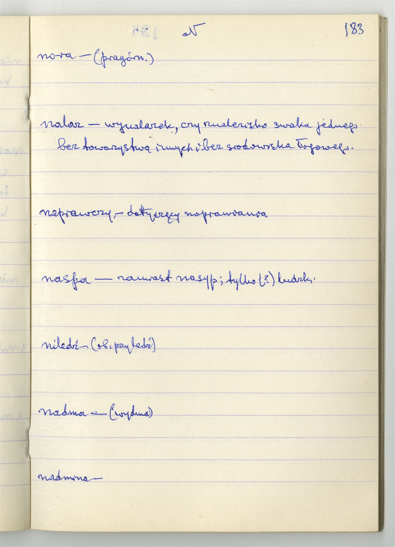 Rękopis słownika sporządzony w zeszycie w linię zatytułowany "K-O i K2 s. 121-240" - strona 49: hasła słownikowe na literę N c.d. (autorska strona 183)