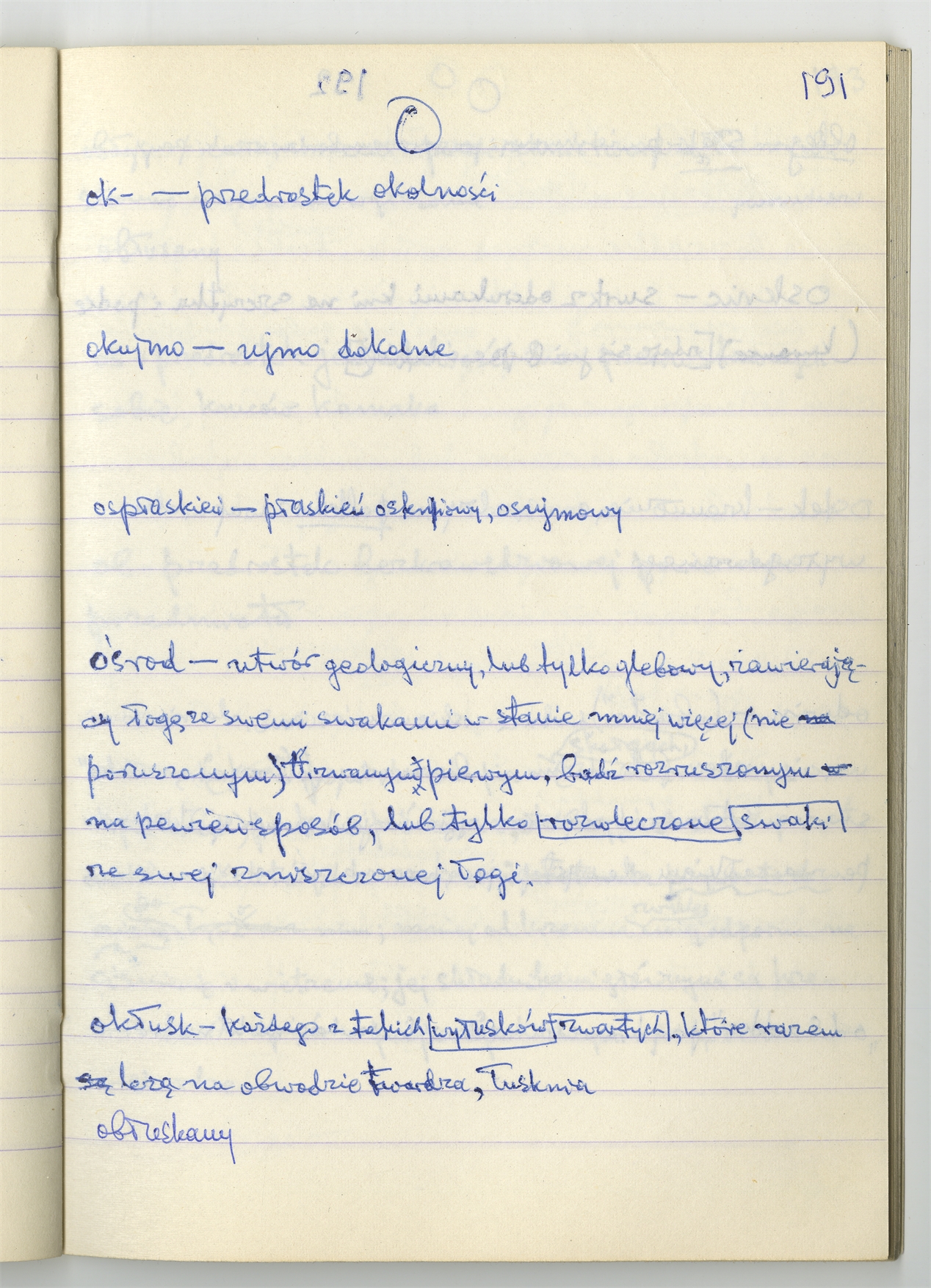 Rękopis słownika sporządzony w zeszycie w linię zatytułowany "K-O i K2 s. 121-240" - strona 50: hasła słownikowe na literę O (autorska strona 191)