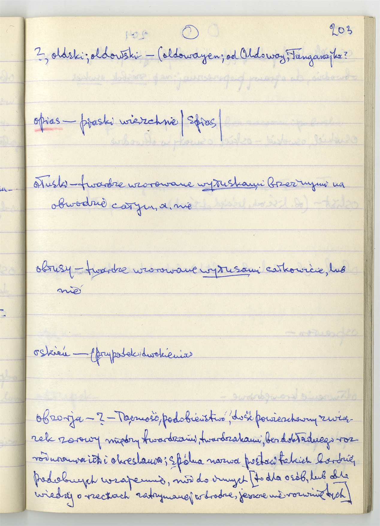 Rękopis słownika sporządzony w zeszycie w linię zatytułowany "K-O i K2 s. 121-240" - strona 62: hasła słownikowe na literę O c.d. (autorska strona 203)