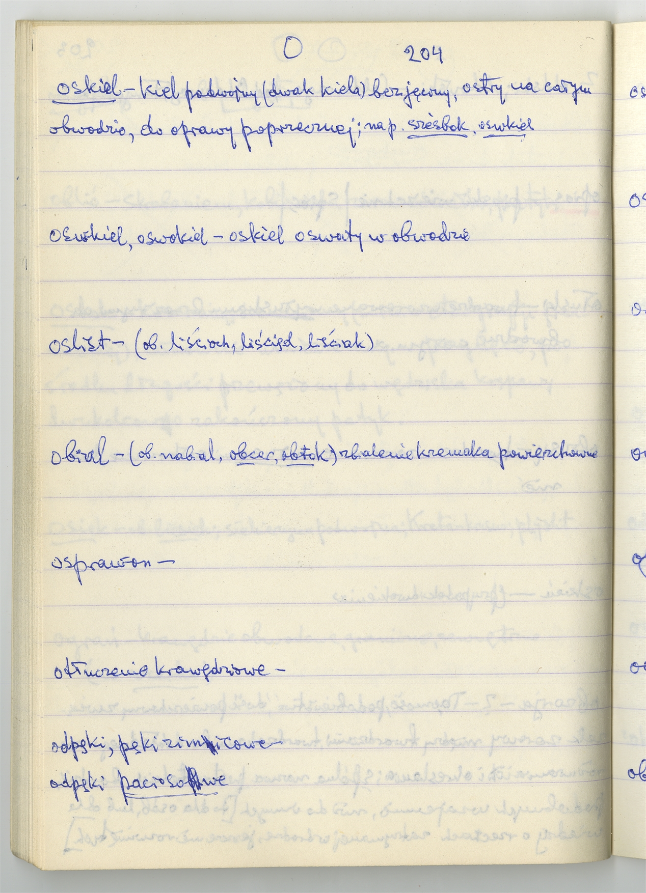 Rękopis słownika sporządzony w zeszycie w linię zatytułowany "K-O i K2 s. 121-240" - strona 63: hasła słownikowe na literę O c.d. (autorska strona 204)