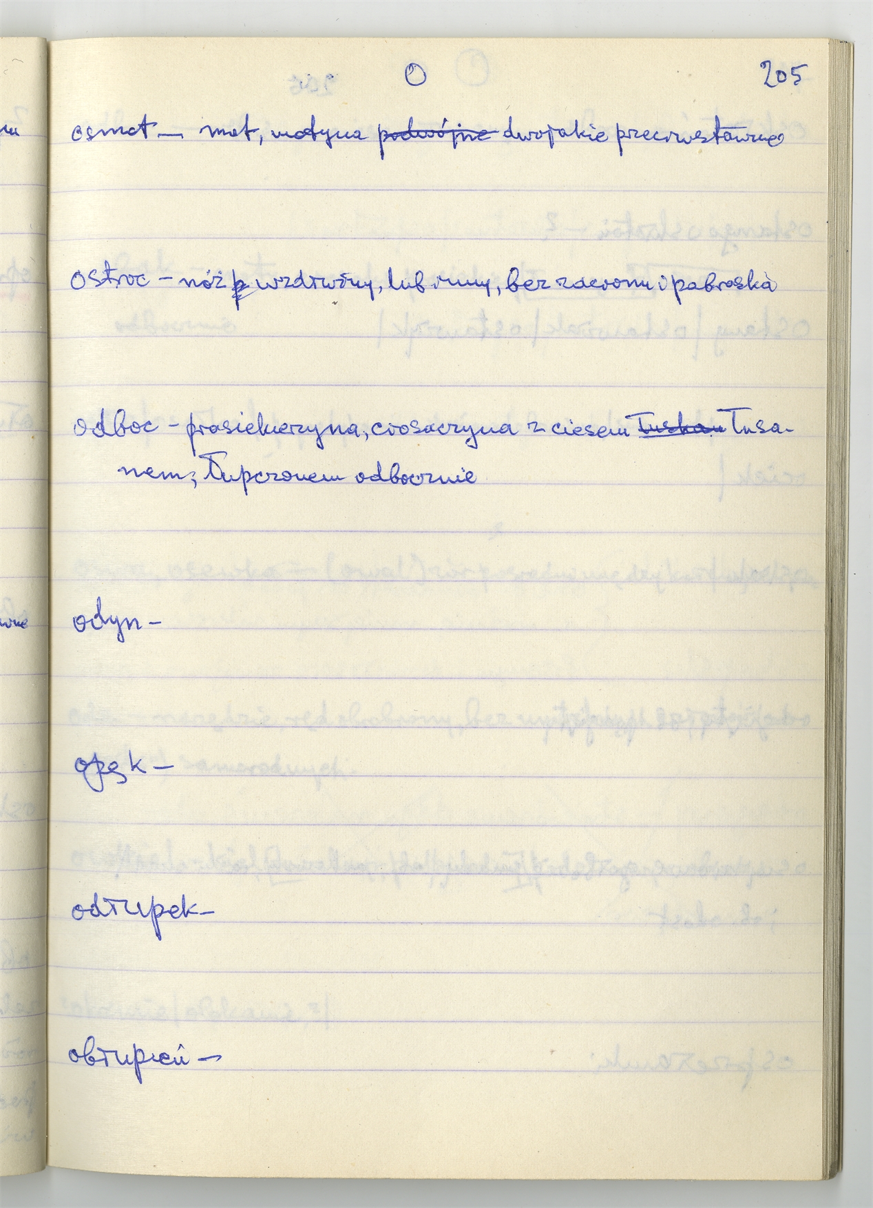 Rękopis słownika sporządzony w zeszycie w linię zatytułowany "K-O i K2 s. 121-240" - strona 64: hasła słownikowe na literę O c.d. (autorska strona 205)
