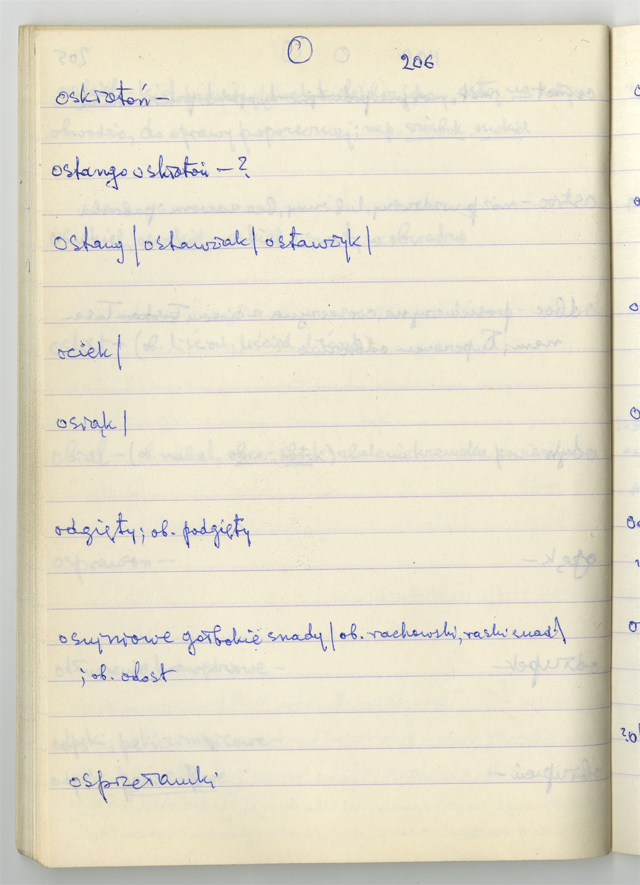 Rękopis słownika sporządzony w zeszycie w linię zatytułowany "K-O i K2 s. 121-240" - strona 65: hasła słownikowe na literę O c.d. (autorska strona 206)