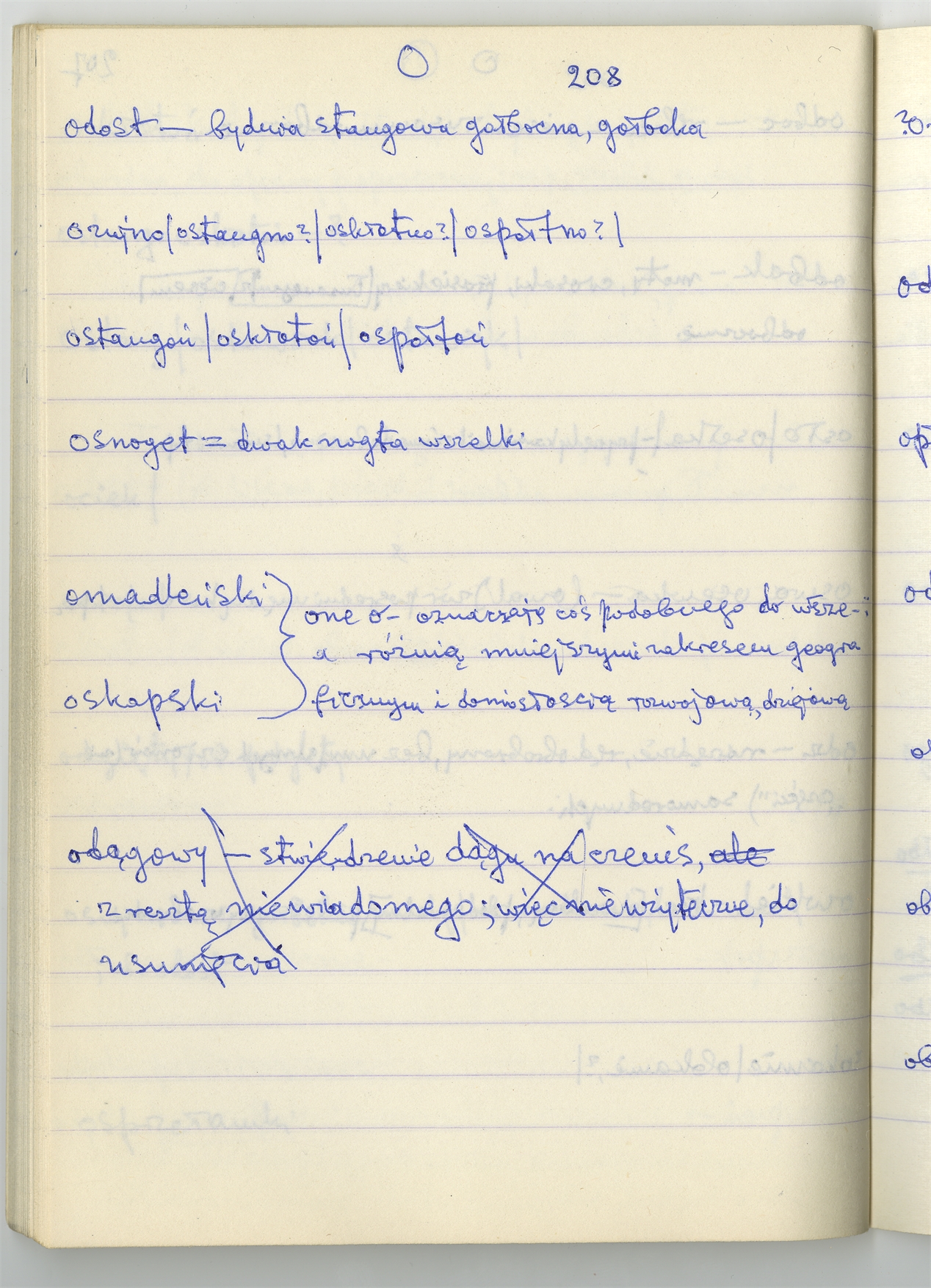 Rękopis słownika sporządzony w zeszycie w linię zatytułowany "K-O i K2 s. 121-240" - strona 67: hasła słownikowe na literę O c.d. (autorska strona 208)