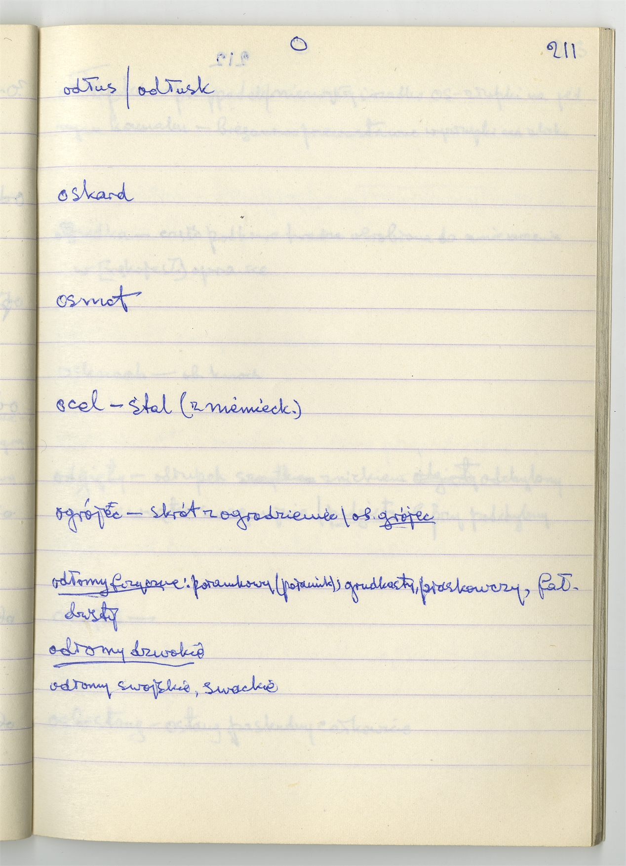 Rękopis słownika sporządzony w zeszycie w linię zatytułowany "K-O i K2 s. 121-240" - strona 69: hasła słownikowe na literę O c.d. (autorska strona 211)
