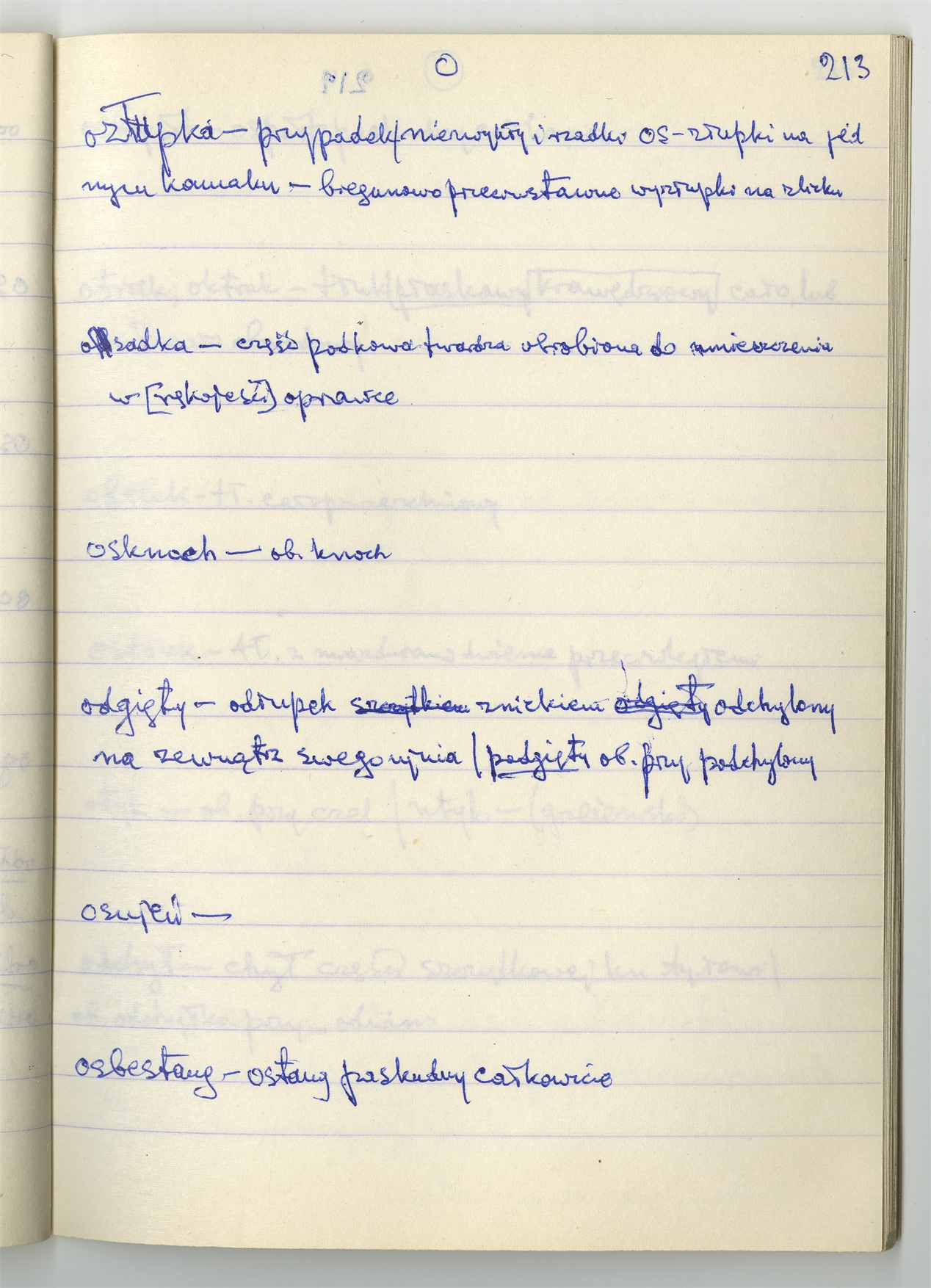 Rękopis słownika sporządzony w zeszycie w linię zatytułowany "K-O i K2 s. 121-240" - strona 70: hasła słownikowe na literę O c.d. (autorska strona 213)