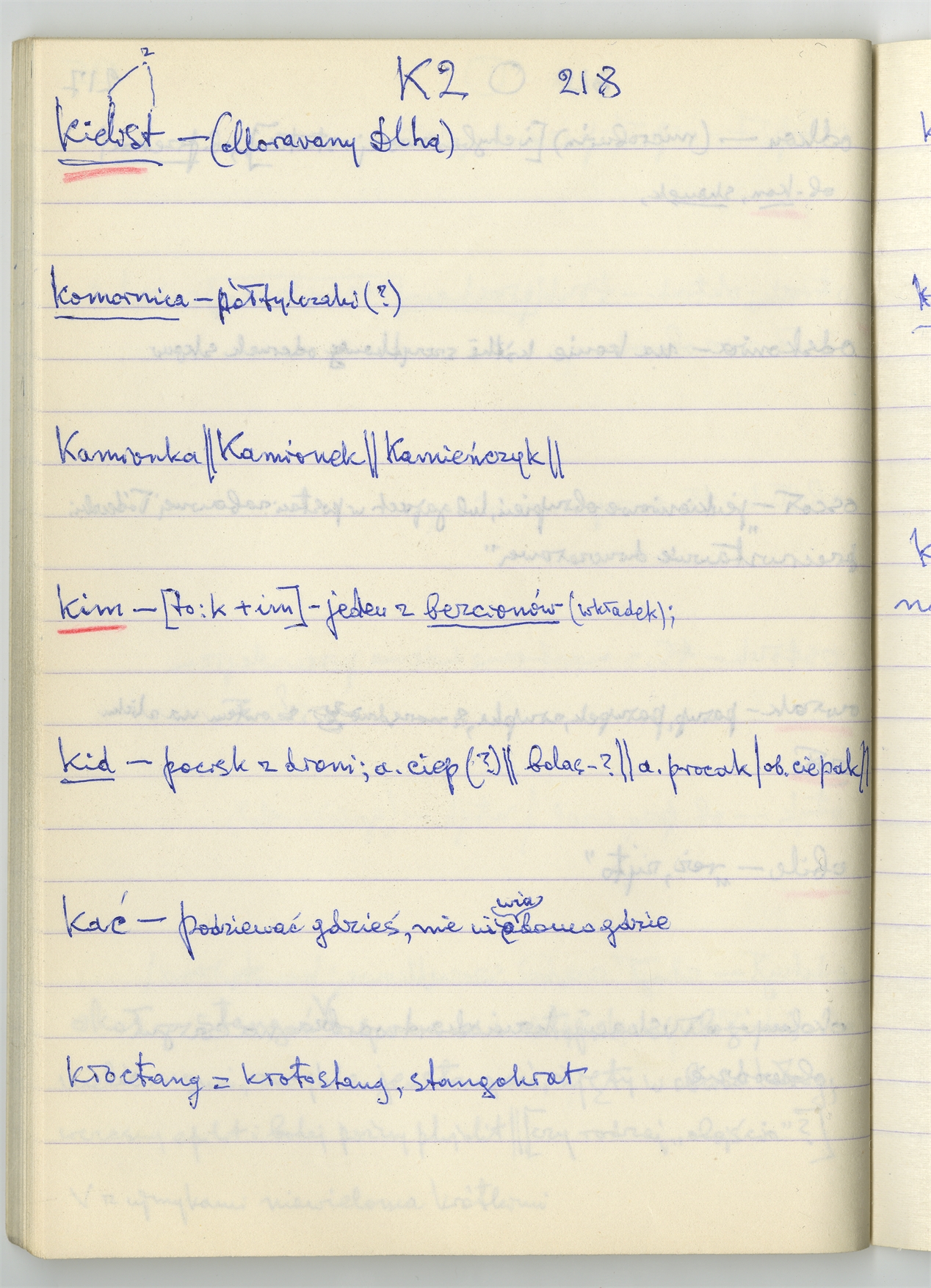 Rękopis słownika sporządzony w zeszycie w linię zatytułowany "K-O i K2 s. 121-240" - strona 74: hasła słownikowe na literę K(2) (autorska strona 218)