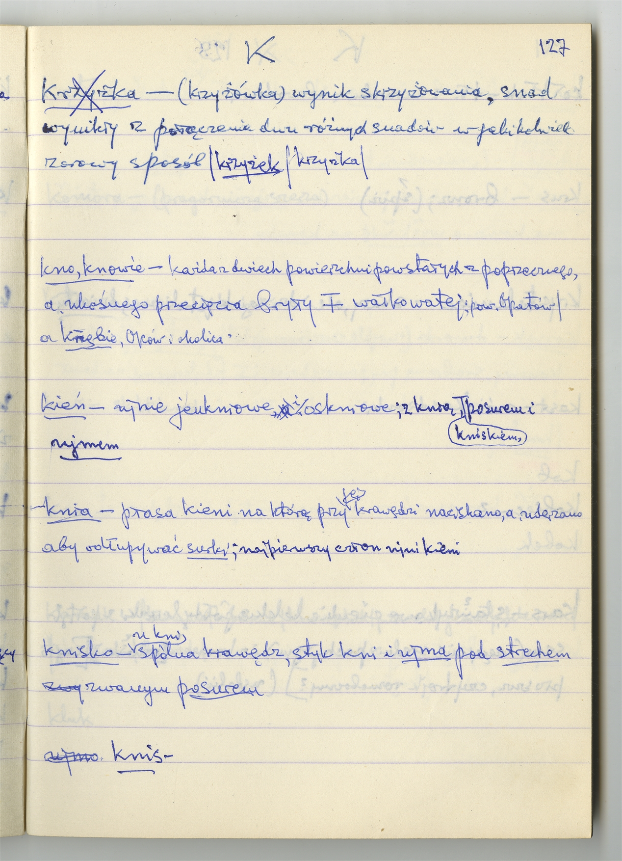 Rękopis słownika sporządzony w zeszycie w linię zatytułowany "K-O i K2 s. 121-240" - strona 8: hasła słownikowe na literę K c.d. (autorska strona 127)