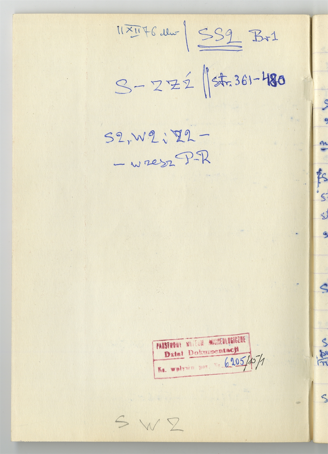 Rękopis słownika sporządzony w zeszycie w linię  zatytułowany "Słownik  S-Z Ż Ź  s. 361-480" - strona 1: tył okładki przedniej z zakresem liter  które słownik zawiera