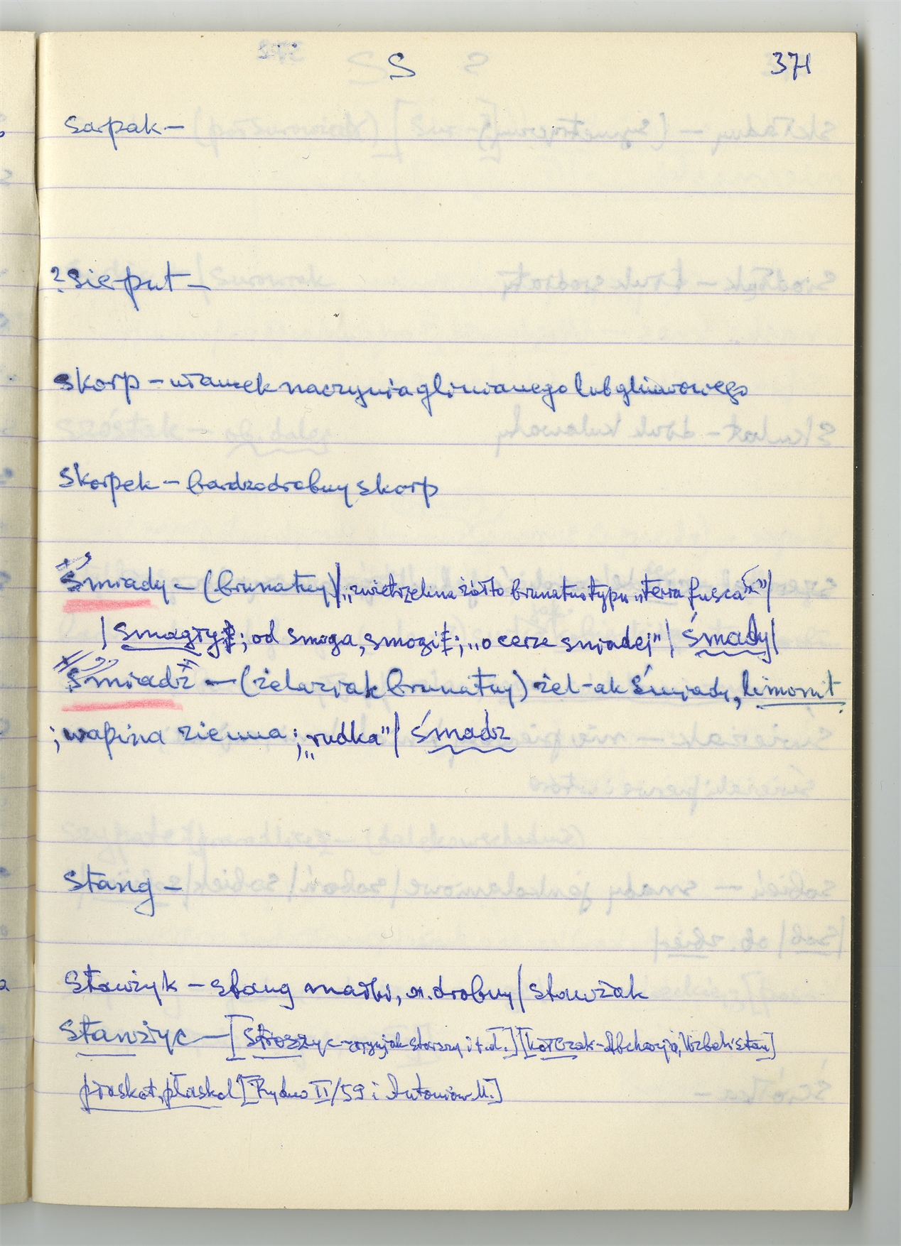 Rękopis słownika sporządzony w zeszycie w linię zatytułowany "Słownik S-Z Ż Ź s. 361-480" - strona 12: hasła słownikowe na literę S c.d. (autorska strona 371)