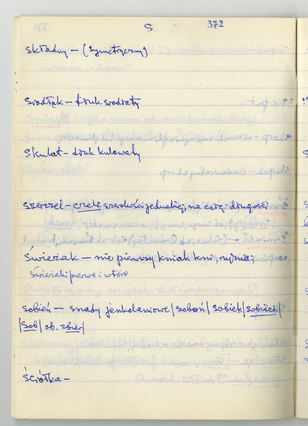 Rękopis słownika sporządzony w zeszycie w linię zatytułowany "Słownik S-Z Ż Ź s. 361-480" - strona 13: hasła słownikowe na literę S c.d. (autorska strona 372)