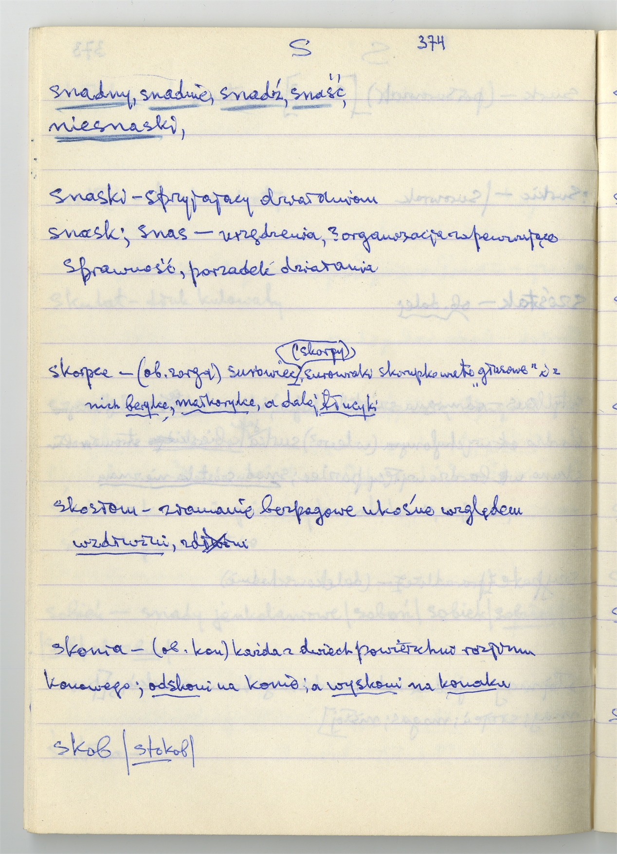 Rękopis słownika sporządzony w zeszycie w linię zatytułowany "Słownik S-Z Ż Ź s. 361-480" - strona 15: hasła słownikowe na literę S c.d. (autorska strona 374)