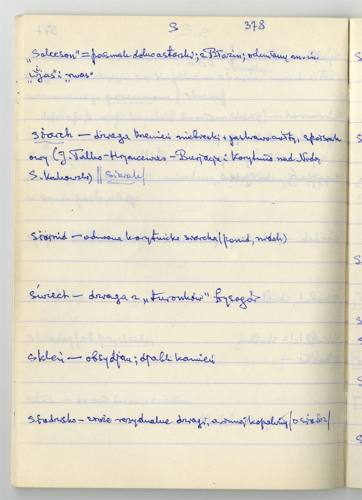 Rękopis słownika sporządzony w zeszycie w linię zatytułowany "Słownik S-Z Ż Ź s. 361-480" - strona 19: hasła słownikowe na literę S c.d. (autorska strona 378)