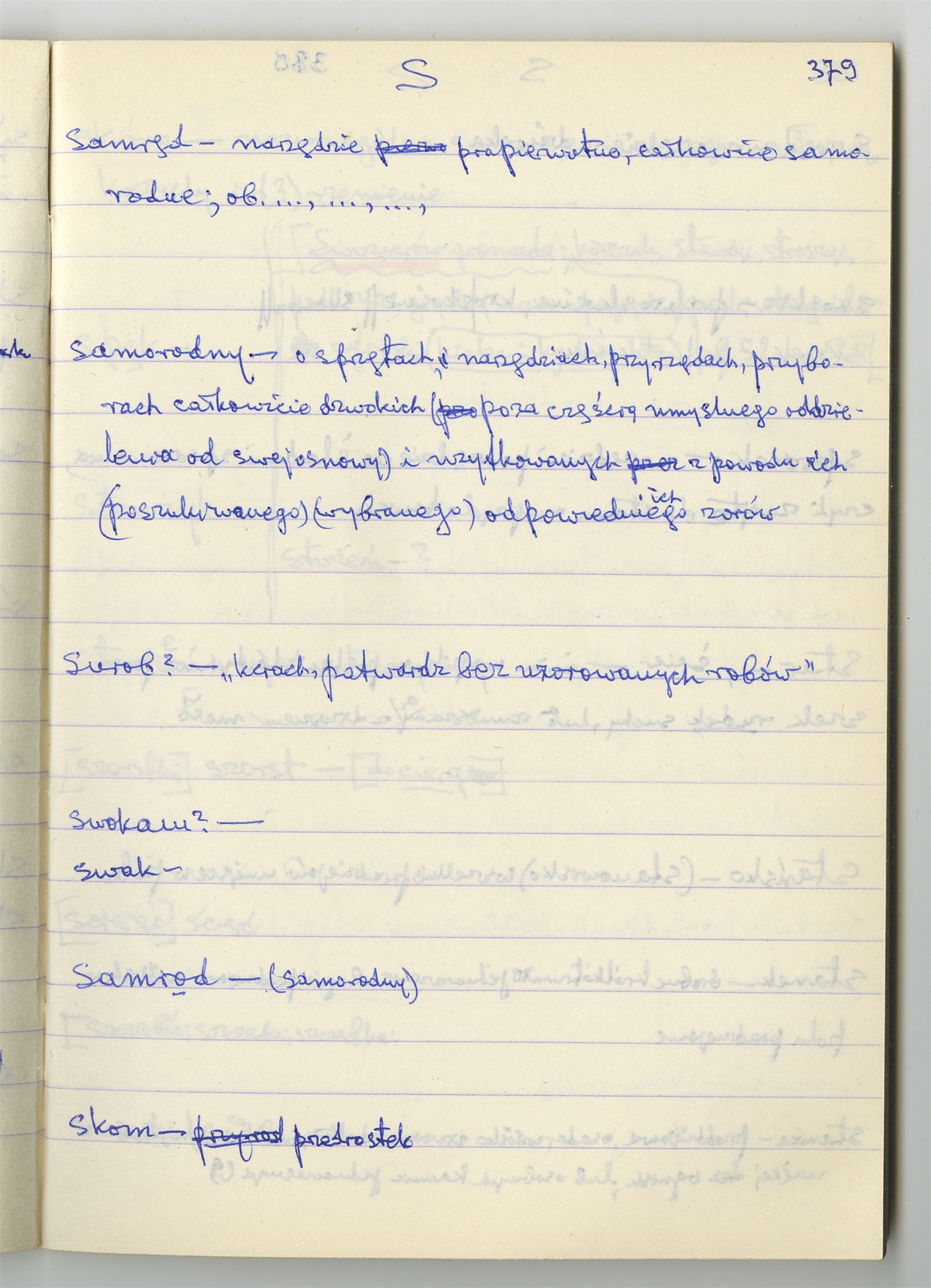 Rękopis słownika sporządzony w zeszycie w linię zatytułowany "Słownik S-Z Ż Ź s. 361-480" - strona 20: hasła słownikowe na literę S c.d. (autorska strona 379)