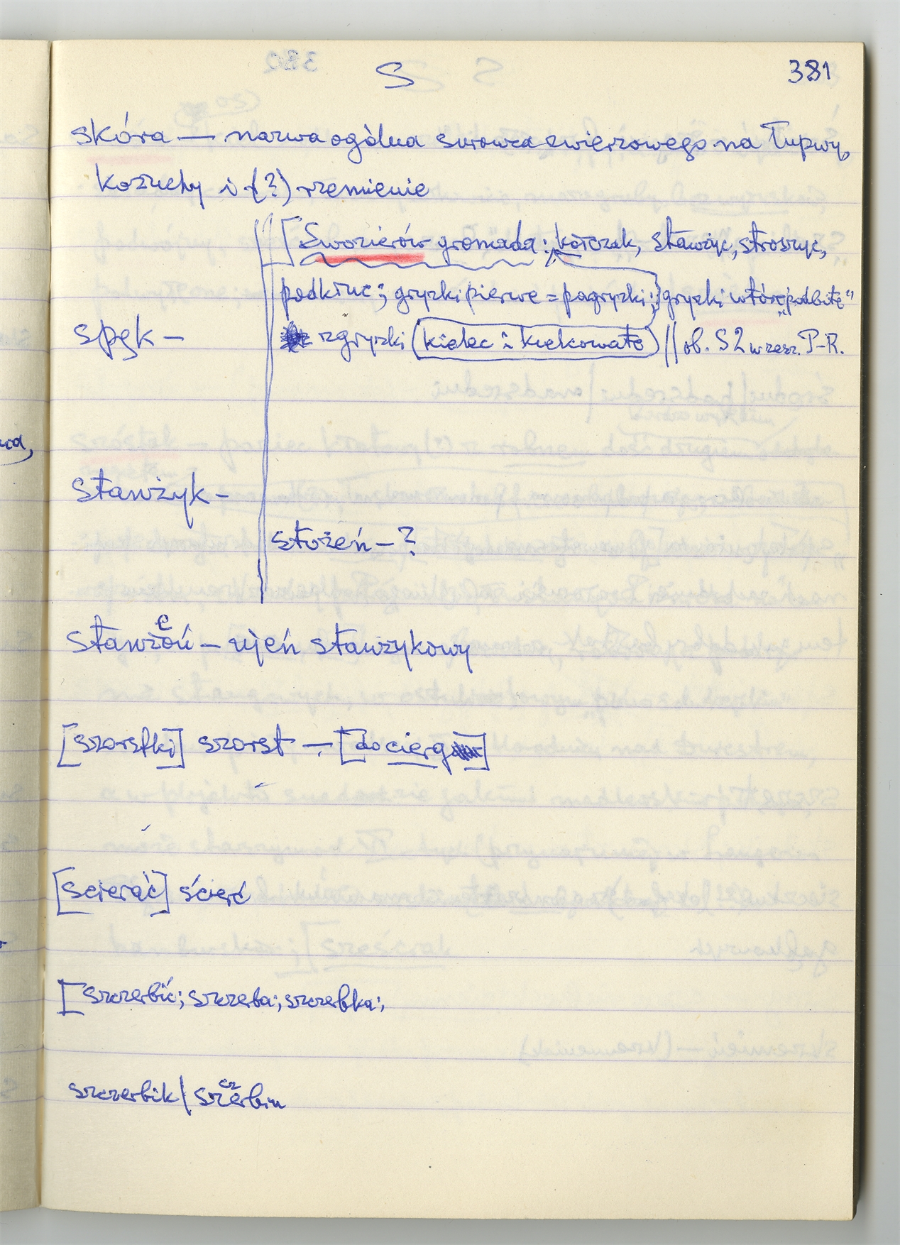 Rękopis słownika sporządzony w zeszycie w linię zatytułowany "Słownik S-Z Ż Ź s. 361-480" - strona 22: hasła słownikowe na literę S c.d. (autorska strona 381)