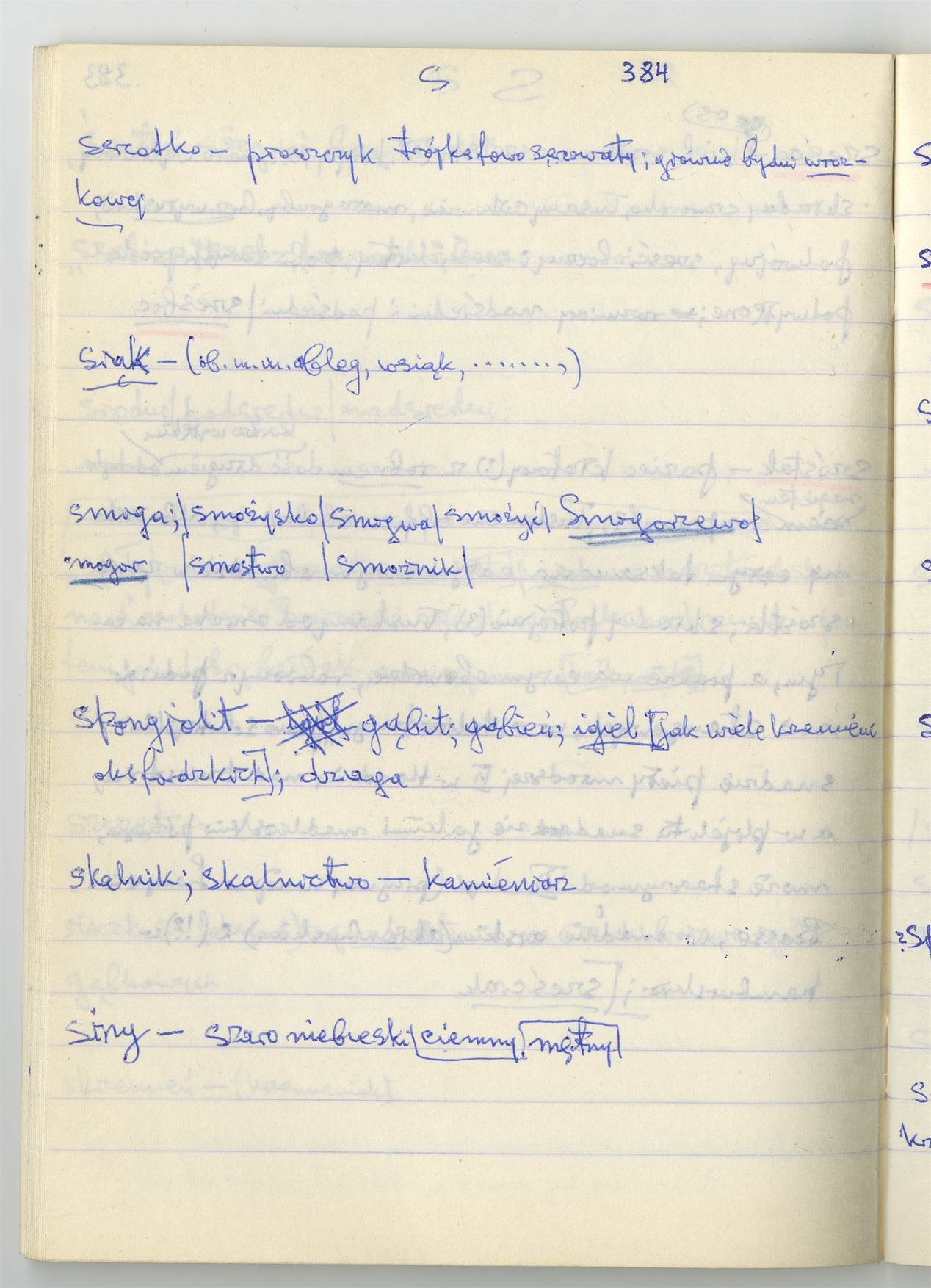 Rękopis słownika sporządzony w zeszycie w linię zatytułowany "Słownik S-Z Ż Ź s. 361-480" - strona 25: hasła słownikowe na literę S c.d. (autorska strona 384)