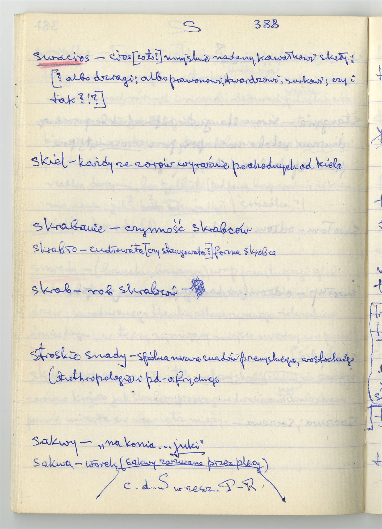 Rękopis słownika sporządzony w zeszycie w linię zatytułowany "Słownik S-Z Ż Ź s. 361-480" - strona 29: hasła słownikowe na literę S c.d. (autorska strona 388)