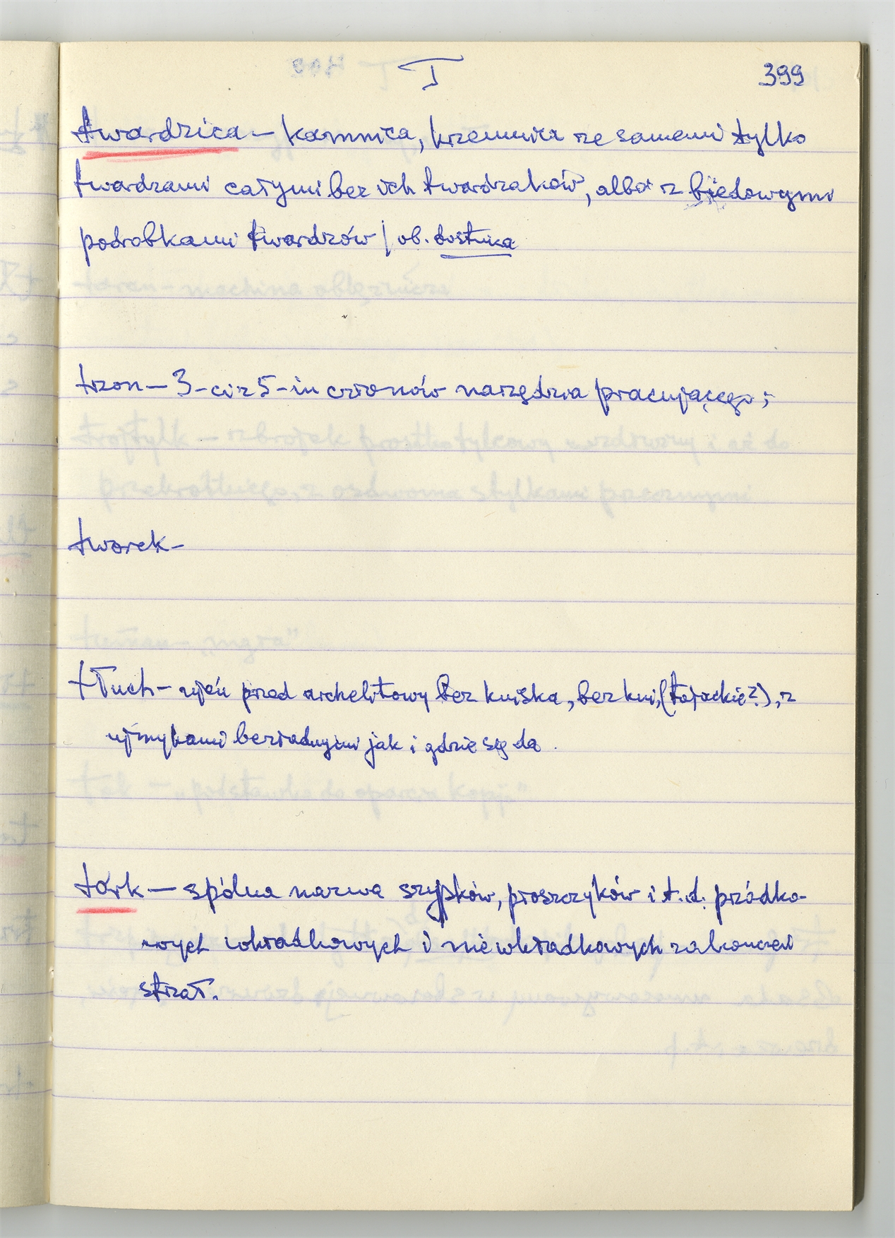 Rękopis słownika sporządzony w zeszycie w linię zatytułowany "Słownik S-Z Ż Ź s. 361-480" - strona 39: hasła słownikowe na literę T c.d. (autorska strona 399)