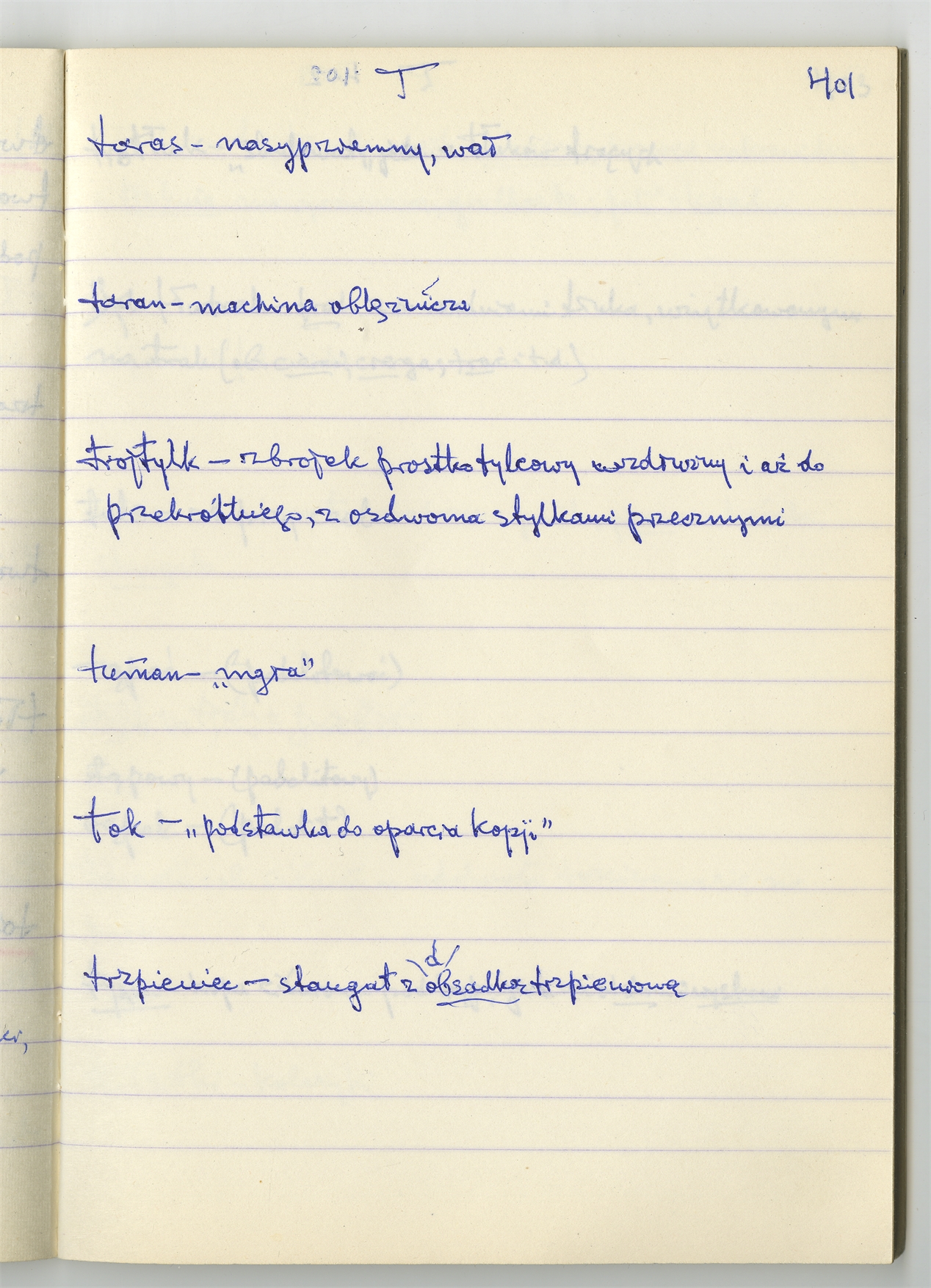 Rękopis słownika sporządzony w zeszycie w linię zatytułowany "Słownik S-Z Ż Ź s. 361-480" - strona 41: hasła słownikowe na literę T c.d. (autorska strona 401)
