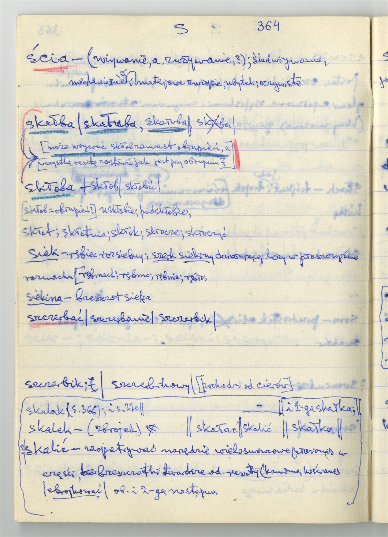 Rękopis słownika sporządzony w zeszycie w linię zatytułowany "Słownik S-Z Ż Ź s. 361-480" - strona 5: hasła słownikowe na literę S c.d. (autorska strona 364)